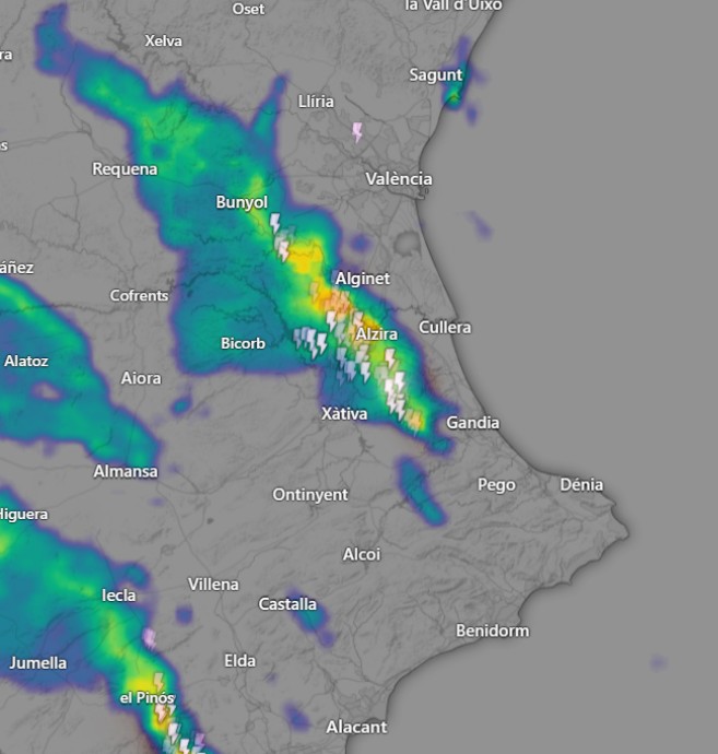 Se están cumpliendo las previsiones de algunos modelos como AROME y Suizo y las fuertes lluvias descargan en una línea entre Buñol y Alzira /Benifairó de la Valldigna.