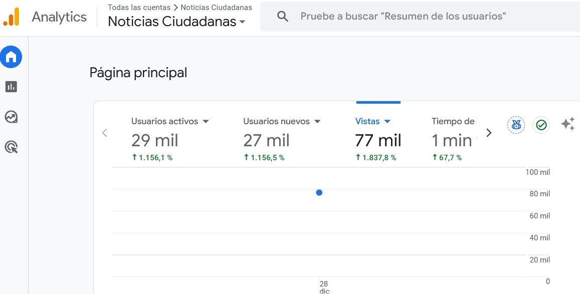 Según los propios datos que arroja Google Analytics, fueron un total de 76.545 las visitas que se registraron, de un total de 29.000 usuarios activos ( lectores únicos) que estuvieron de media leyendo un minuto las noticias de actualidad sobre las consecuencias de las intensas lluvias.