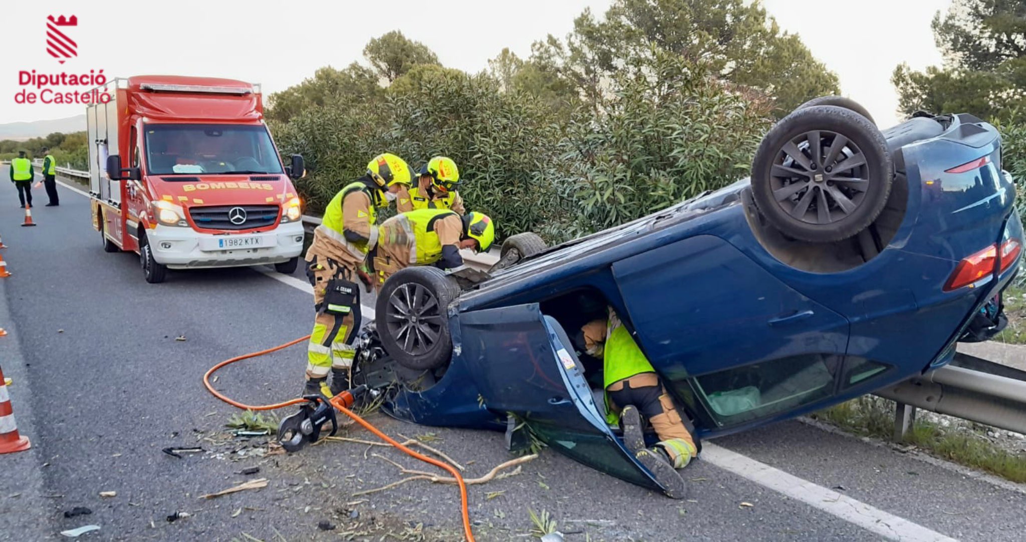 OROPESA DEL MAR – Una dotación de los Bomberos de la Diputación de Castellón, pertenecientes al parque de la Plana Alta, se ha movilizado de urgencia este lunes tras recibir el aviso de un accidente de tráfico en la autopista AP-7, dentro del término municipal de Oropesa. El incidente, que consistió en el vuelco de un turismo, generó momentos de tensión ante la posibilidad de que los pasajeros hubieran quedado atrapados en el interior del habitáculo.