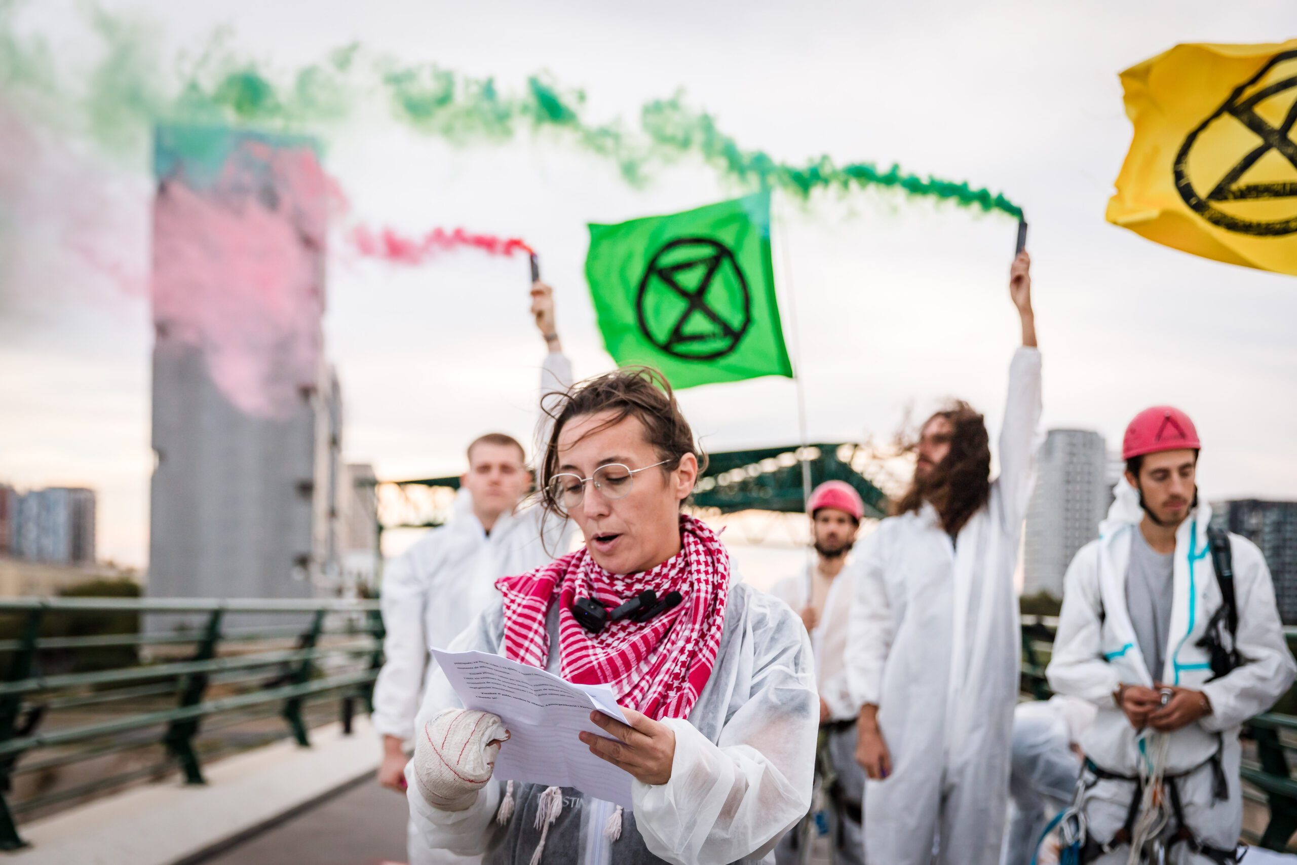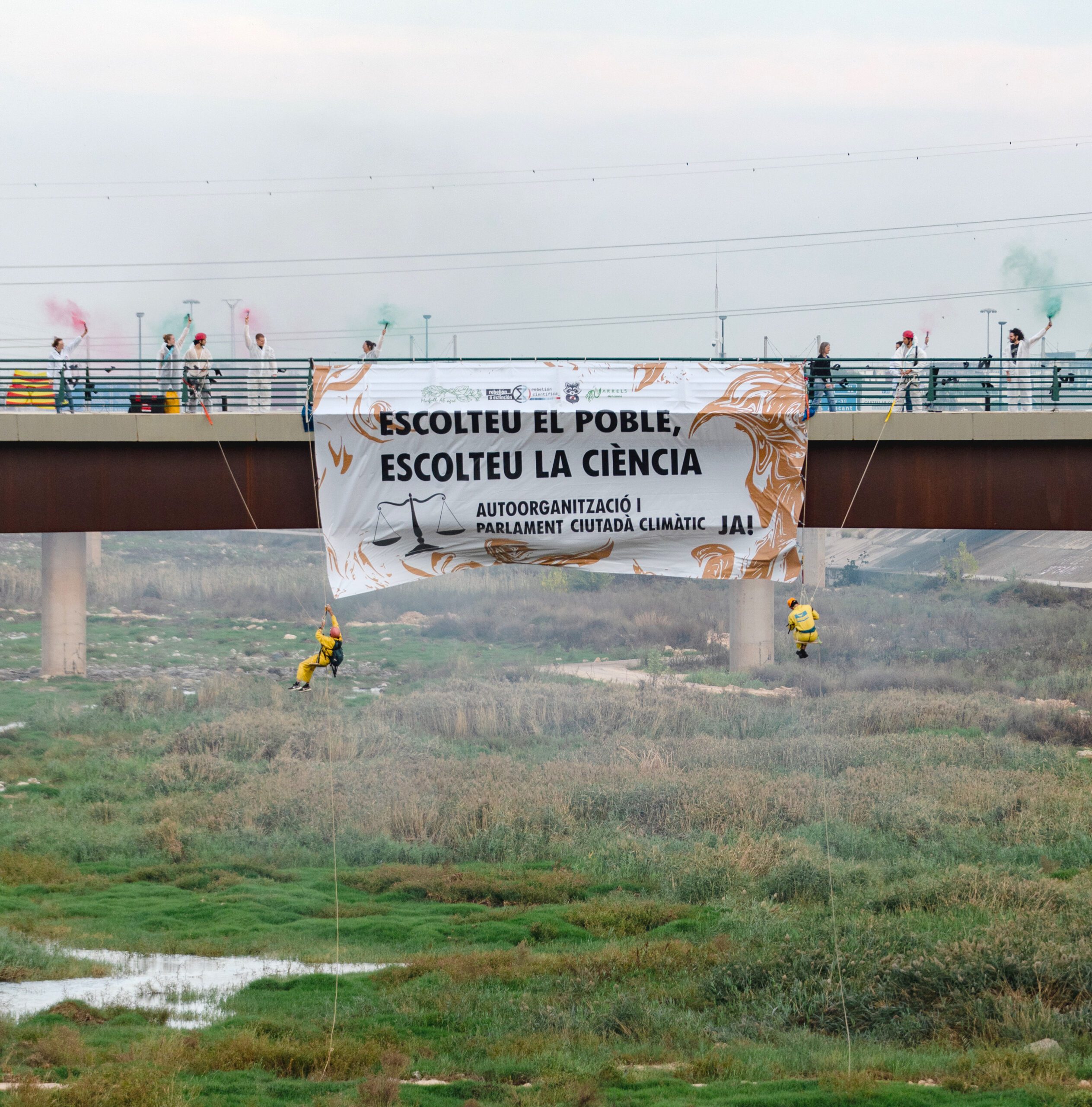 Dos activistas se han colgado del Puente de la Soledaridad a las 17 horas para desplegar una pancarta reclamando medidas frente a la crisis ecosocial. También han encendido botes de humo de color verde, por la justicia climática y rojo, por las víctimas reclamando medidas frente a la crisis ecosocial. La acción, en la que han participado activistas de los colectivos Rebelión o Extinción, Rebelión Científica, Arrels del Canvi, Rccoon y Youth Climate Save, tiene como objetivo denunciar la inacción y el negacionismo climático.