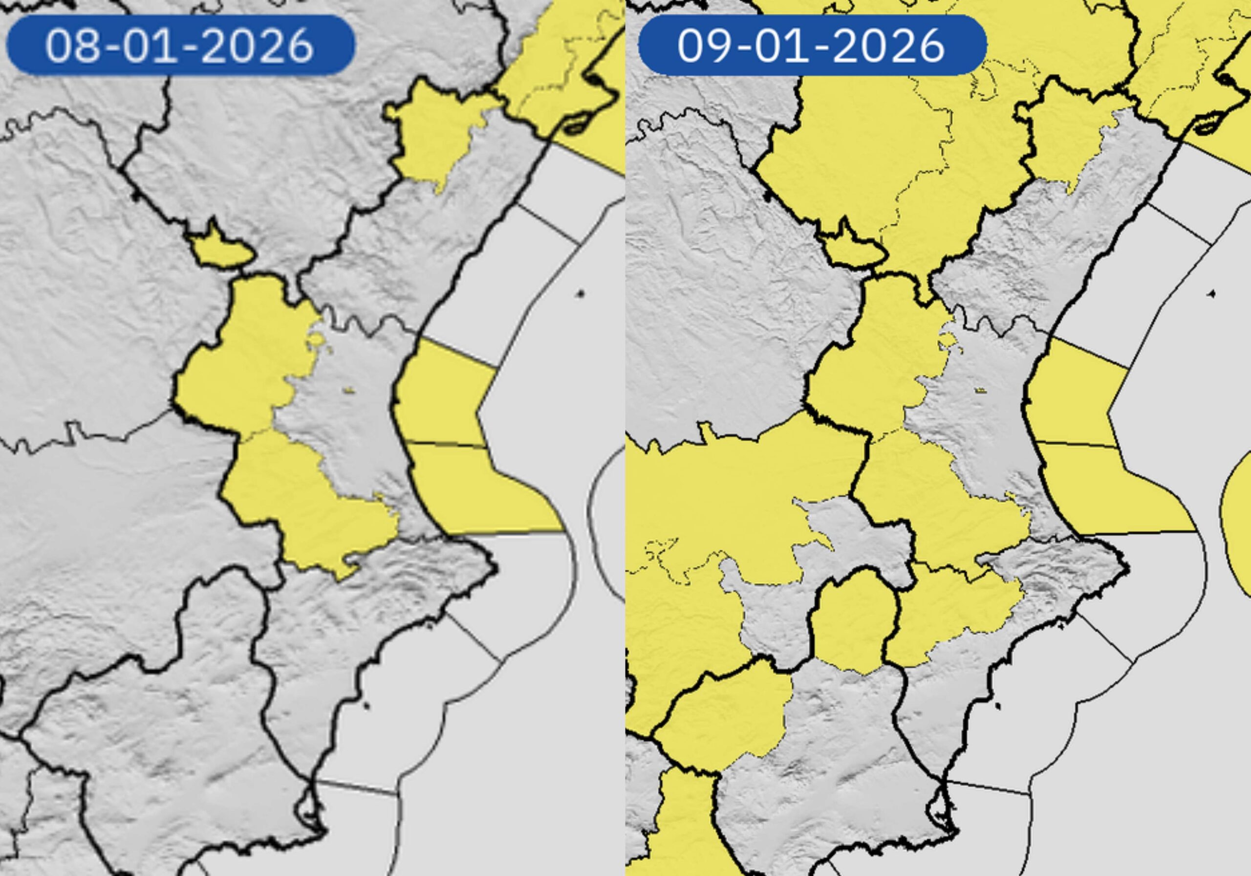 - Zona litoral del Golfo de Valencia, avisos por mala mar y por oleaje derivado del viento. Esta circunstancia al darse de poniente no afectará al litoral más inmediato, protegido por las poblaciones y la costa. Se activa a las 17:00h del 8 de enero y dura hasta las 23:59h. Viento fuerza 7 de vientos de hasta 65 km/h.