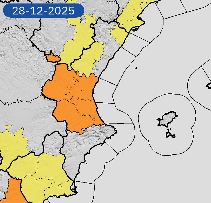 • Alerta naranja en toda la costa de Valencia por lluvias que podrán acumular 30 litros por metro cuadrado en una hora o hasta 100 litros por metro cuadrado en 12 horas. Desde las 7:00h hasta las 23:59 horas.