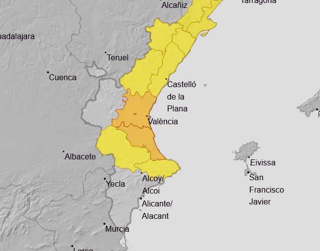 A partir de las 8:00h de la mañana sólo deja la costa norte de Castelló en alerta naranja y pasa a aviso amarillo hasta las 12:00h. la costa de Valencia, la costa Sur de Castelló y el interior norte de Castelló, dejando en naranja el litoral norte de Castelló.