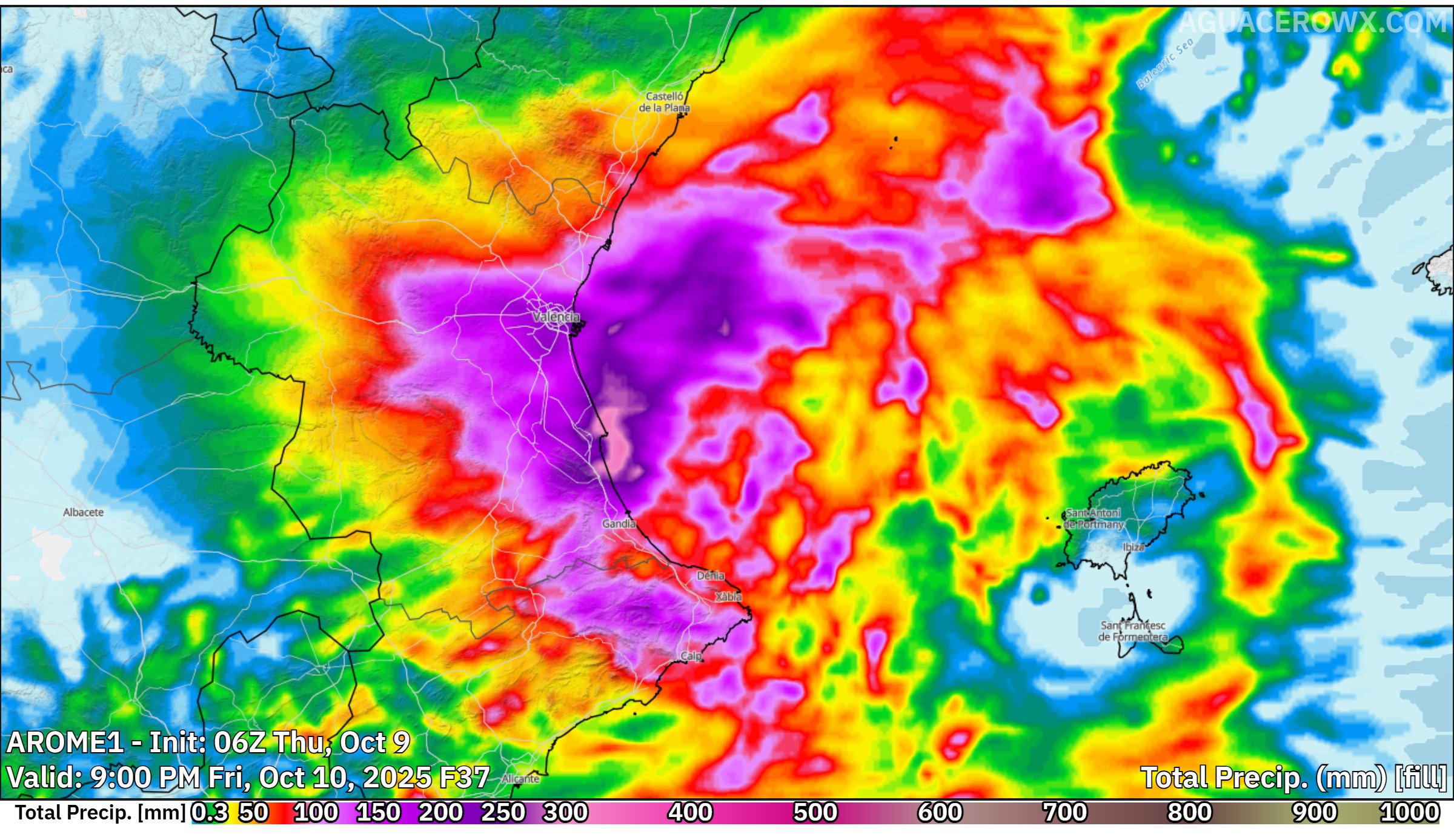 El AROME pronostica acumulados de más de 400 litros en algunas zonas del sur del Golfo de Valencia para estas jornadas entre el 9 y 11 de Octubre, esperemos se equivoque y no sea tanto.