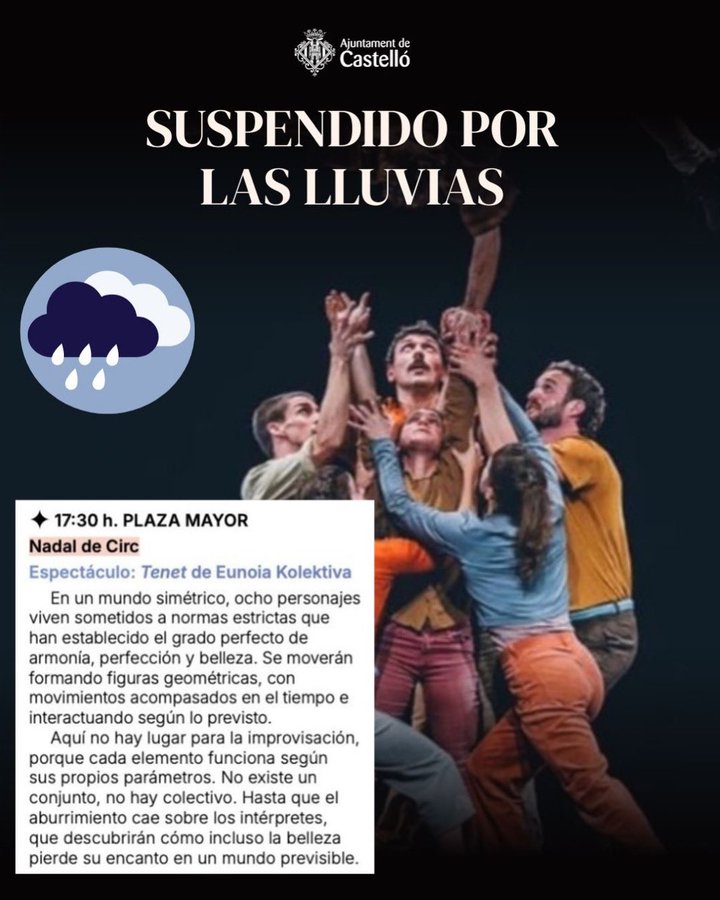 Debido a las condiciones meteorológicas adversas, queda también suspendida la actuación de esta tarde a las 17:30h de Eunoia Kolektiva, dentro del ciclo de teatro y animación Nadal de Circ.
