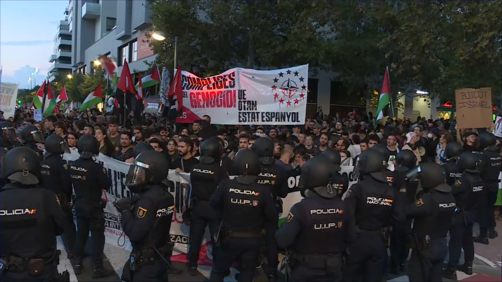El acto principal se desarrolló en los alrededores del pabellón valenciano, donde un grupo de manifestantes trató de romper el cordón policial para acercarse a las puertas del recinto. La policía respondió con cargas para dispersar a los concentrados, lo que derivó en varios forcejeos y detenciones.