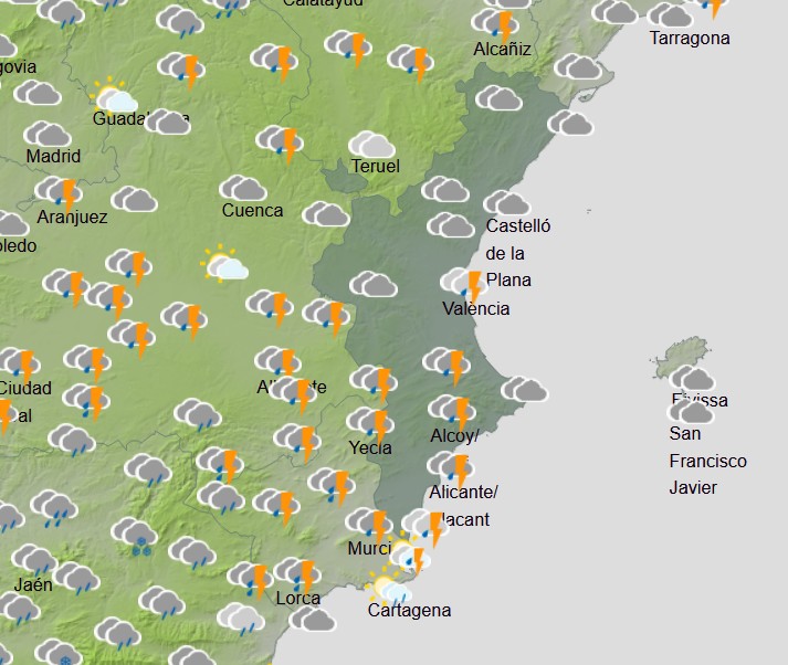 Según los modelos meteorológicos, se espera un cielo muy nuboso o cubierto. Las precipitaciones serán generalizadas y podrían ir acompañadas de barro, debido a la presencia de polvo en suspensión, un fenómeno que complica aún más las tareas de mantenimiento de los monumentos que ya empiezan a asomar en las calles (la «plantà» técnica).