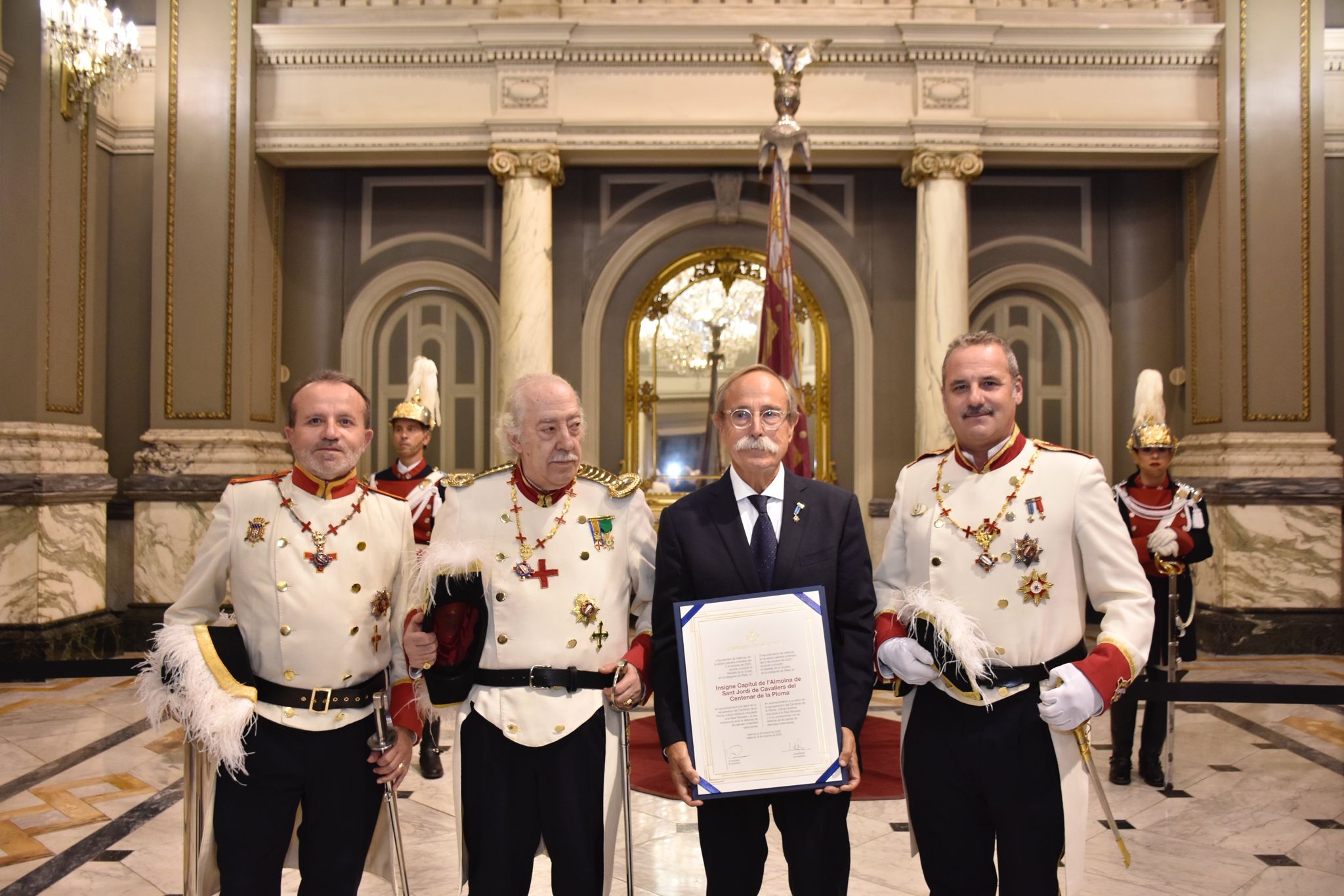 Ayer, l’Insigne Capítul de l’Almoina de Sant Jordi del «Centenar de la Ploma» por segundo año consecutivo custodió a la Real Senyera en su exposición pública en la saló de Cristall de l’Ajuntament de Valéncia, custodiando la Real Senyera como hacían antaño en la época medieval.
