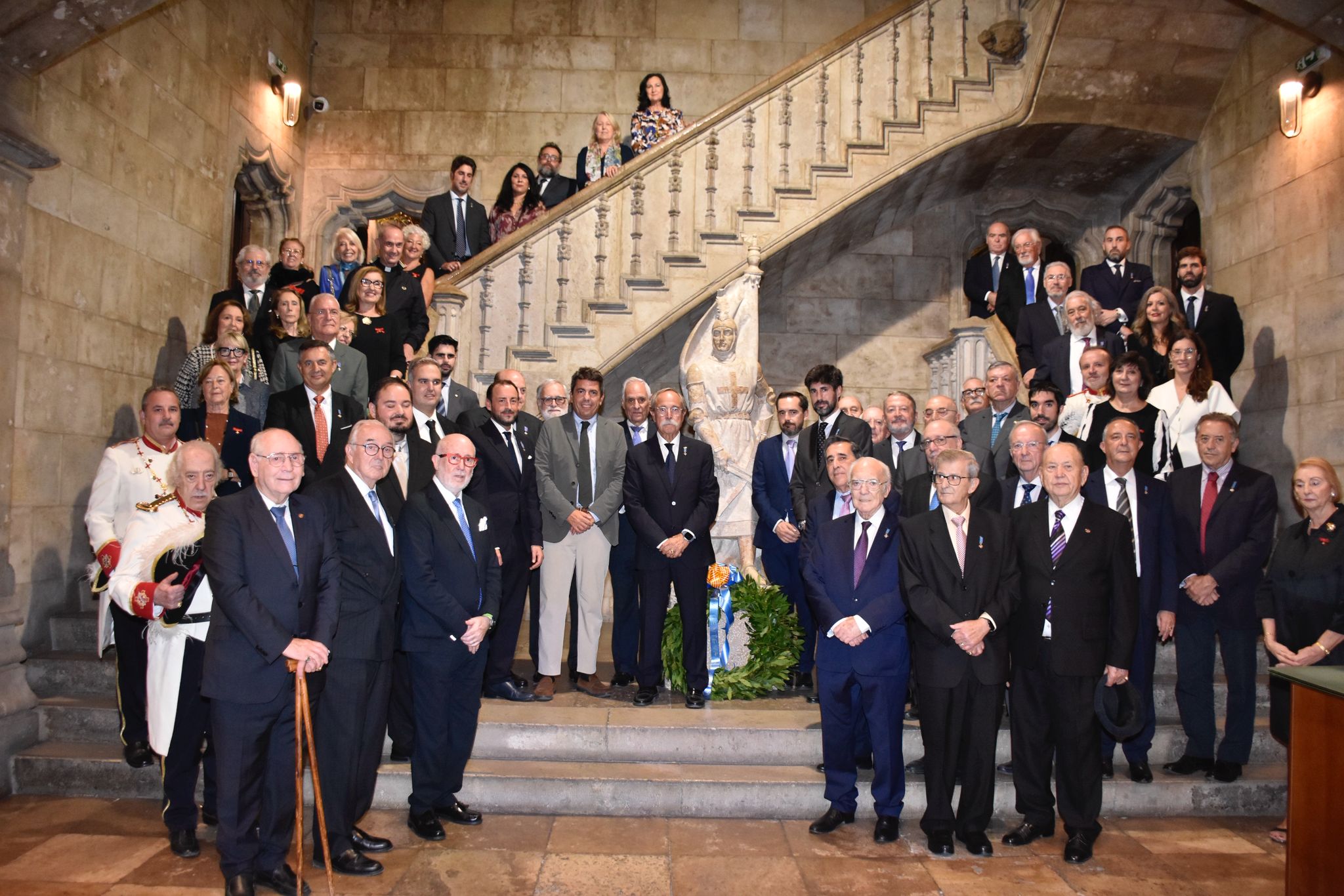 Finalmente se dirigieron a la Puerta de la Plaza de Manises de la Generalitat Valenciana, a la estatuta que recuerda al Ballester Major del Centenar de la Ploma, ante la que depositaron otra ofrenda de corona de laurel, y fueron recibidos por el propio President de la Generalitat Valenciana, Carlos Mazón.