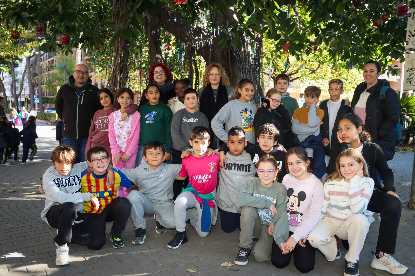 Torrent, 28/11/2025. Esta mañana, 144 alumnos de cuatro centros educativos de Torrent han tenido una cita muy especial, y es que los estudiantes de El Molí, Antonio Machado, María Auxiliadora y Santo Tomás de Aquino se han congregado en la Avenida Al Vedat para ver colgados los adornos navideños – que durante semanas han preparado con mucho entusiasmo – que ahora decoran los emblemáticos ficus de Torrent.