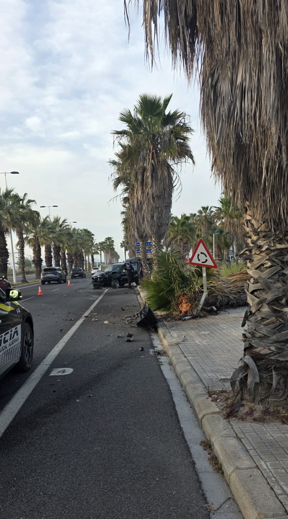 Limpieza viaria: Operarios municipales han trabajado en la retirada de cristales y fluidos del motor para garantizar la adherencia de la vía. Además los servicios de jardinería han tenido que retirar un palmito arrancado de cuajo por el vehículo y tirado en la acera.