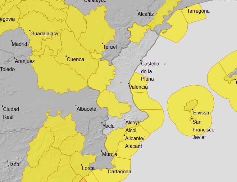 - Por fenómenos costeros en la costa de Valencia y Alicante por rachas de viento de entre 50-60km/h y oleaje fuerza 7.