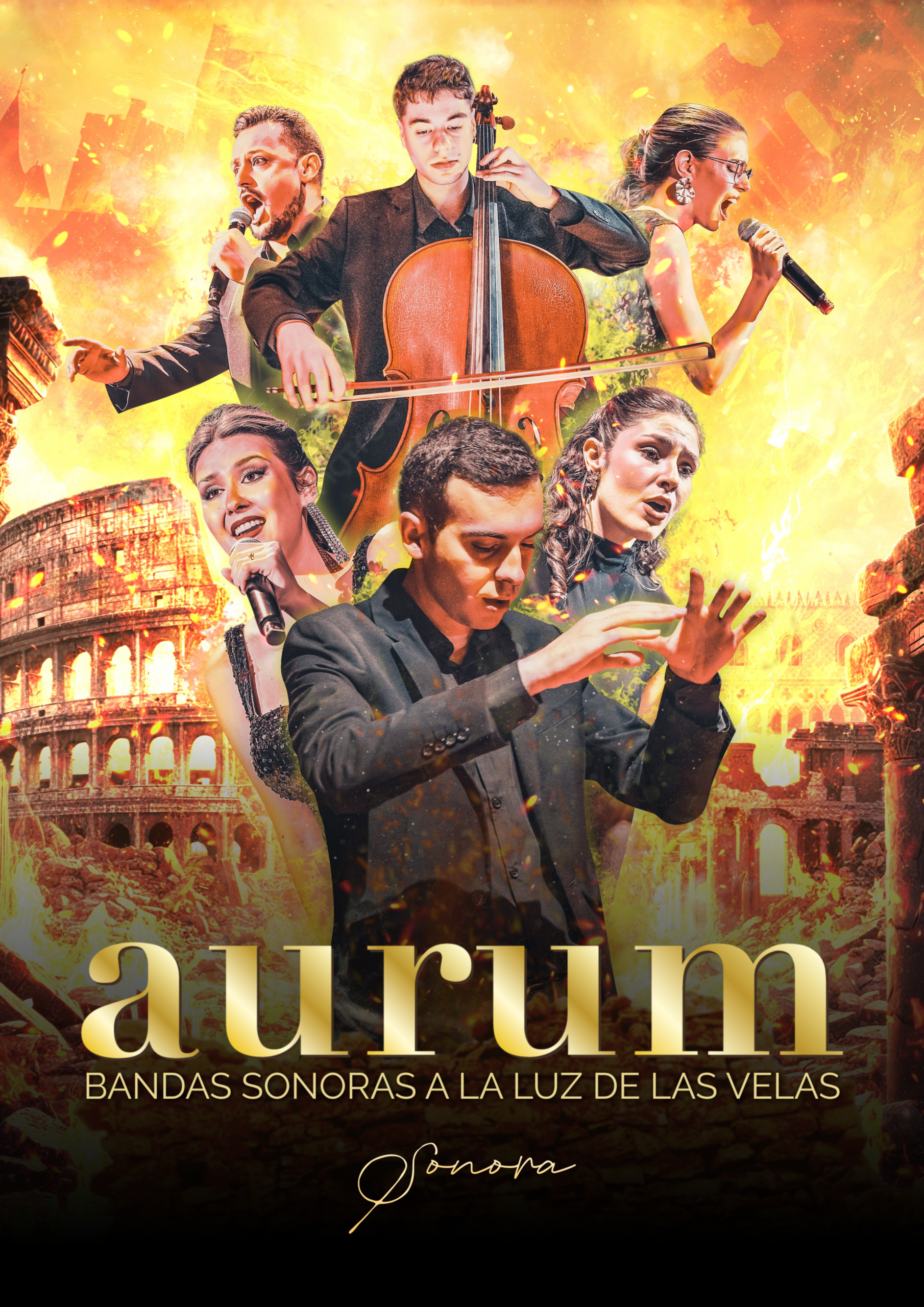 Lo que diferencia a AURUM de un concierto convencional es su cuidada puesta en escena. El espectáculo se desarrolla en una atmósfera de absoluta intimidad, donde el escenario y el patio de butacas quedan envueltos por el resplandor de más de mil velas LED. Este entorno visual, diseñado para potenciar la conexión emocional, sirve de marco para que la Orquesta y Coro de Cámara SONORA interprete en directo algunas de las partituras más memorables de la historia del cine.