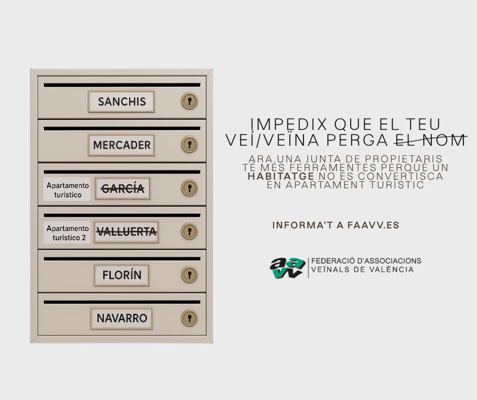 Ante la total falta de eficacia de las medidas del Ayuntamiento para perseguir la actividad ilegal de los apartamentos turísticos que siguen invadiendo viviendas y bajos comerciales, ante la incertidumbre del desastre de registro público de la Generalitat Valenciana en el que no hay ni el 80% de la oferta real registrada, la Federació d’Associacions Veïnals de Valéncia (FAAVV) ha presentado a todas las asociaciones vecinales de la ciudad una campaña informativa que se va a desplegar en todos los barrios para explicar los recientes cambios en la Ley de la Propiedad Horizontal que facultan a las comunidades de propietarios a prohibir el alojamiento turístico en sus fincas.