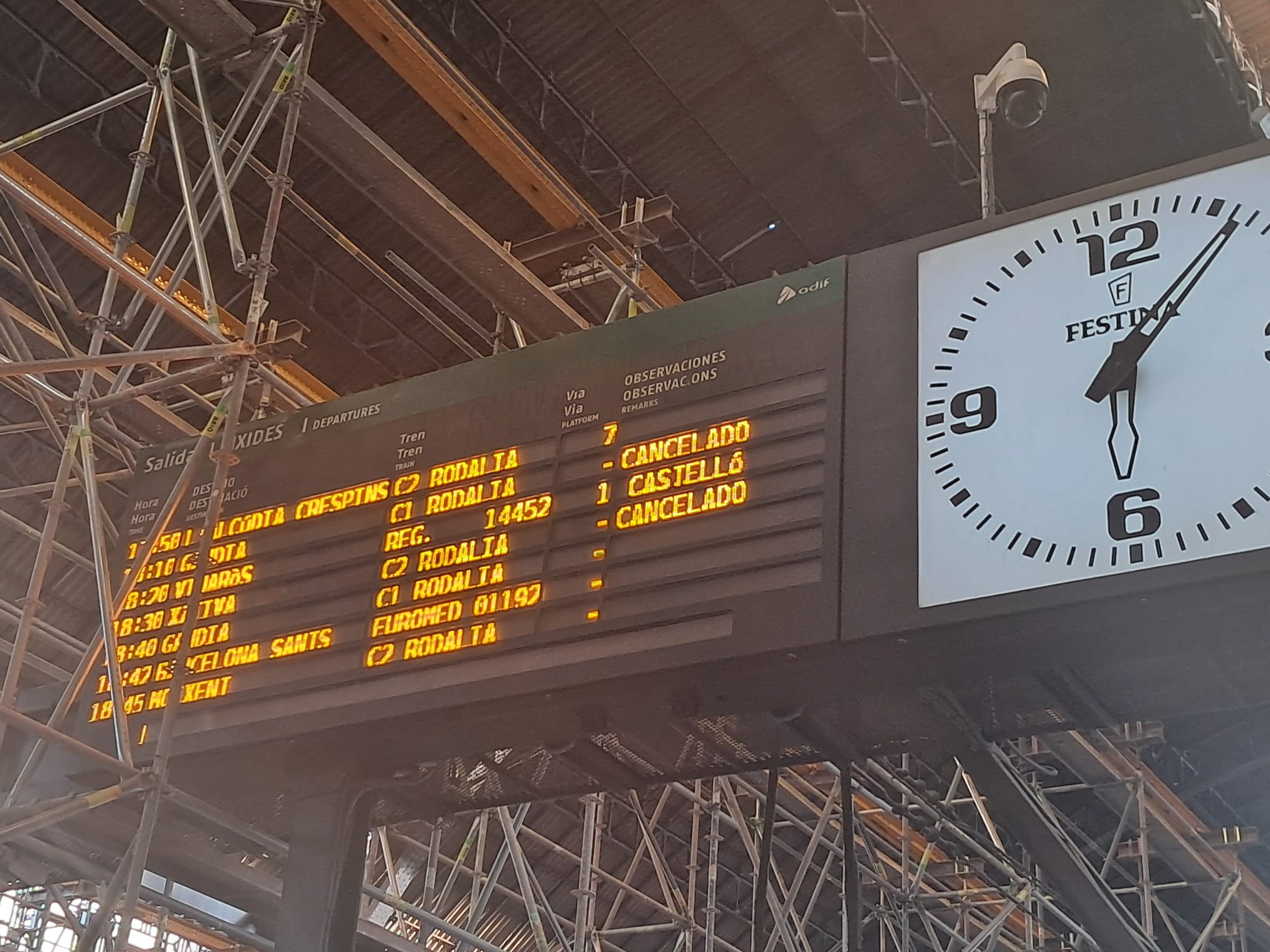 Esta tarde se ha producido una cascada de cancelaciones y de retrasos en las líneas C1 y C2 de cercanías de Valencia que no levantan cabeza. El tren de las 18:16 con destino Gandía se ha cancelado unos minutos antes pero también se ha cancelado el tren de la c-2 con destino Gandía de las 18:30 horas.
