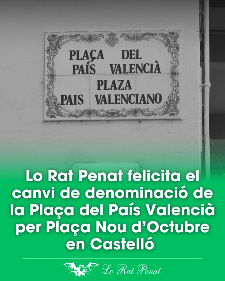👏Lo Rat Penat, entitat centenària dedicada a la defensa de la llengua, la cultura i l’identitat del poble valencià, vol felicitar als partits polítics de l’Ajuntament de Castelló, que han fet possible la substitució de la denominació Plaça del País Valencià per Plaça Nou d’Octubre, aixina com reconéixer públicament la tasca i gestió de l’Associació Cultural Valencianista Cardona Vives de Castelló, que durant anys ha defés esta reivindicació justa i necessària.