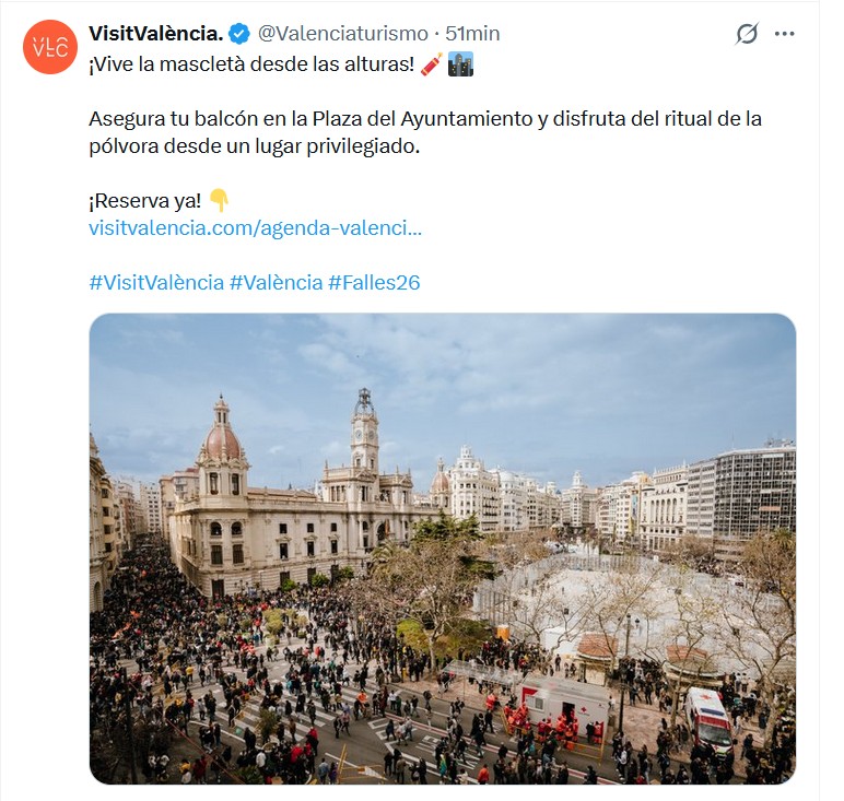 La cuenta atrás para las Fallas de 2026 ha comenzado con un choque frontal entre la seguridad ciudadana y el modelo de explotación turística de la ciudad. Mientras el área de Licencias del Ayuntamiento de Valéncia ha dictado el cese fulminante de la actividad en 19 «pisos falleros» de la Plaza del Ayuntamiento por riesgo estructural y falta de licencia, la fundación municipal VisitValència mantiene en su escaparate digital la promoción de experiencias en balcones privados que operan bajo dinámicas similares. Esta dicotomía pone de relieve la tensión entre el descanso vecinal, la seguridad en fincas antiguas y el imparable negocio de las «vistas VIP» a la mascletà.