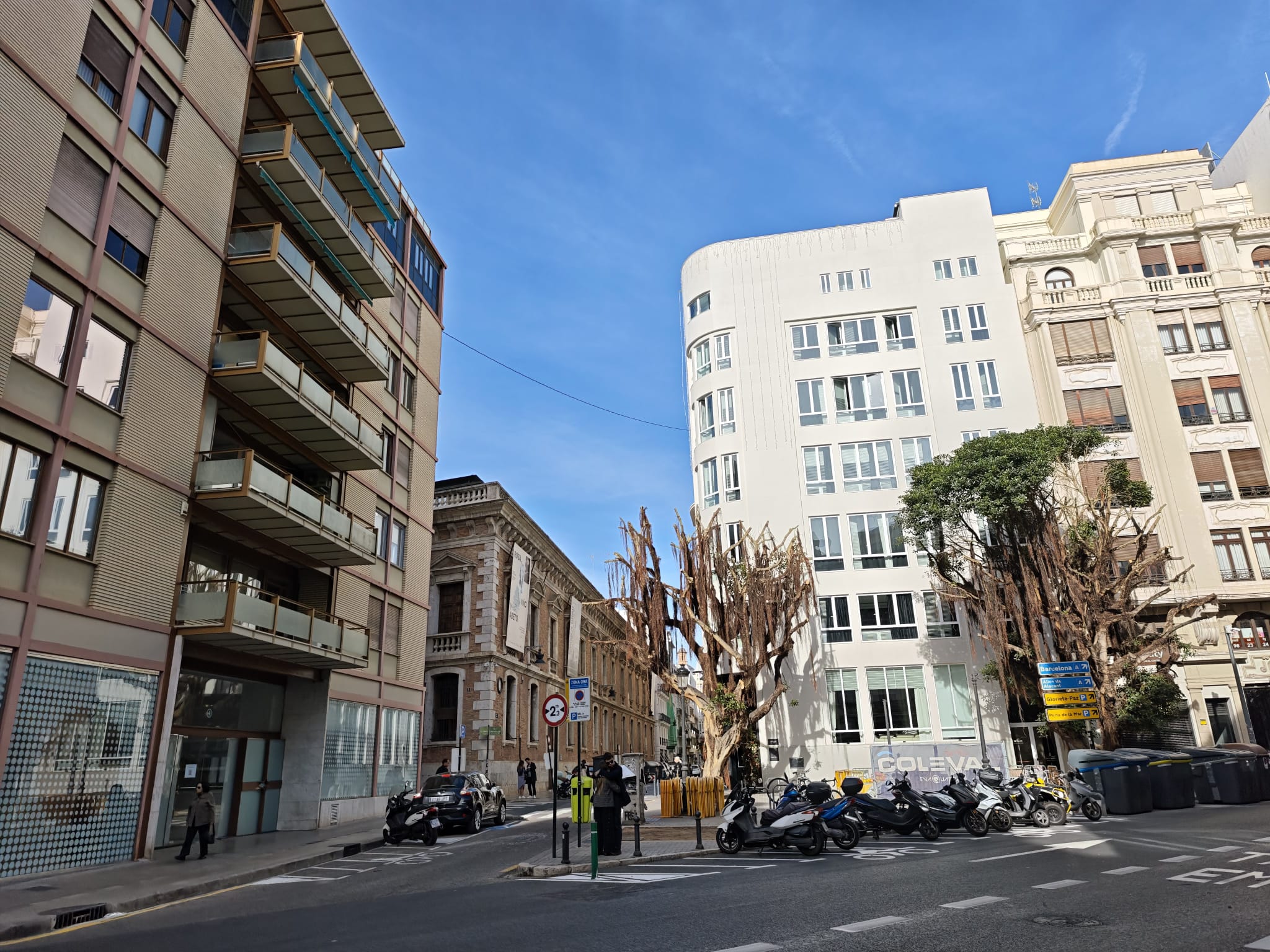 Días después este ficus elástica fue podado y talado y sus dos compañeros, otros dos ficus elástica en la esquina entre las calles Comedias y Pintor Sorolla que ya se habían quedado huérfanos de su colega de vida, del otro ficus ahora fueron sometidos a una tala siniestra que los desposeyó de su alma y los dejó desnudos, feos, horribles…