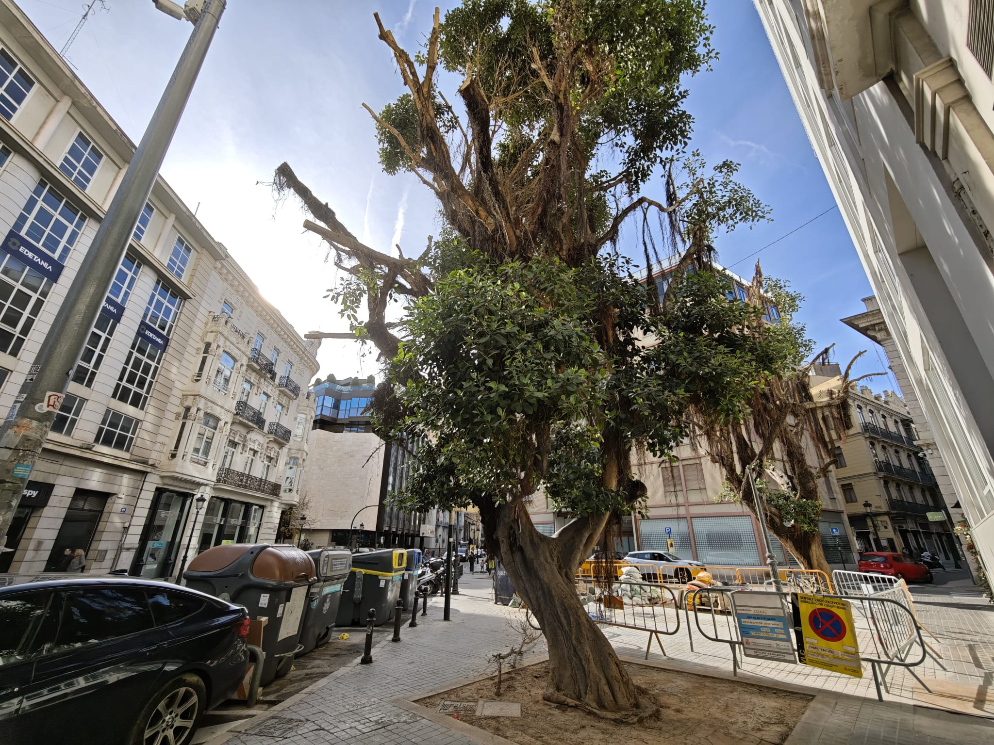 Recuerden la última vez que en torno al 9 d’Octubre el aviso naranja de lluvias y cientos arrancó uno de los tres ficus elástica de Pintor Sorolla y cayó sobre el cajón de un gran camión…