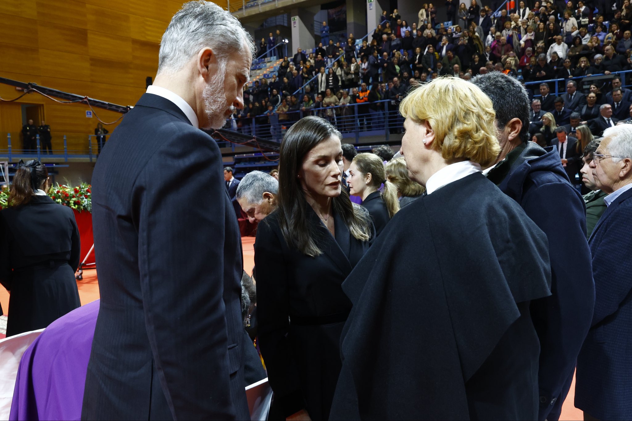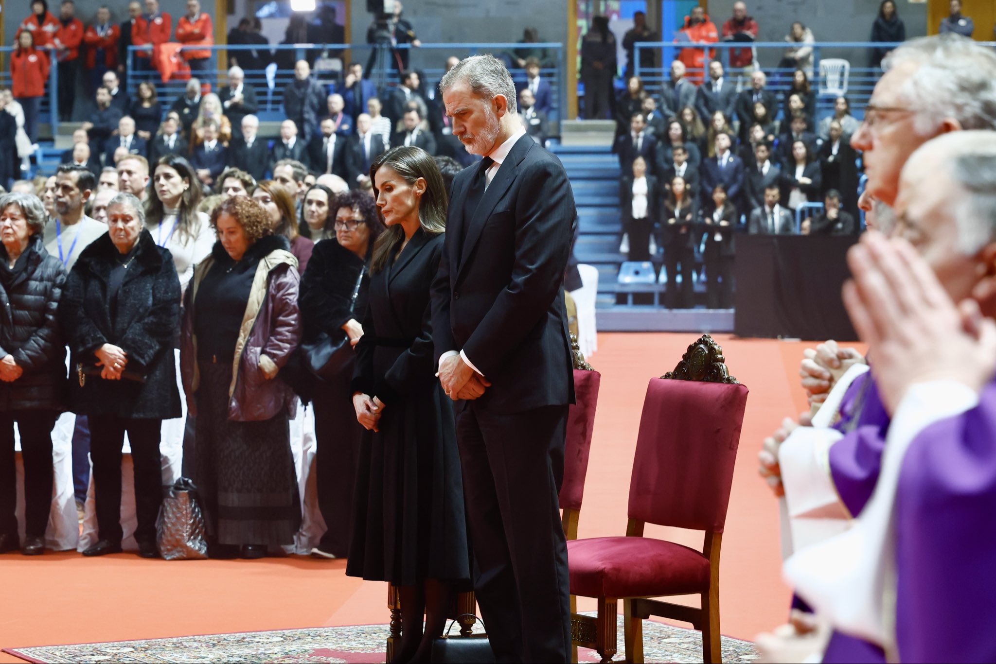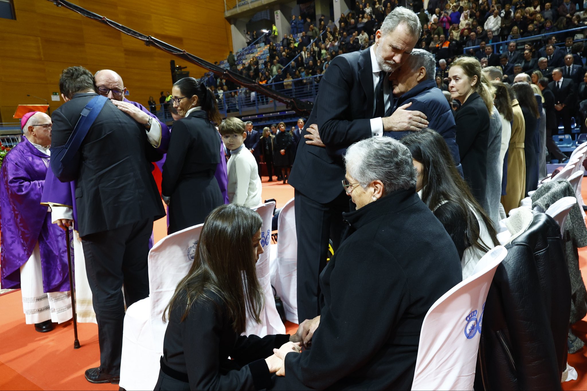 Frente a la entrada discreta de los ministros, Sus Majestades los Reyes, Felipe VI y Letizia, llegaron por el acceso principal y fueron recibidos con un silencio respetuoso que rompió en aplausos. Tras la misa, oficiada por el obispo Santiago Gómez Sierra, los monarcas protagonizaron el momento más humano de la jornada al permanecer más de una hora en la pista del pabellón, saludando uno a uno a los familiares de los 45 fallecidos y compartiendo su dolor sin barreras de seguridad.
