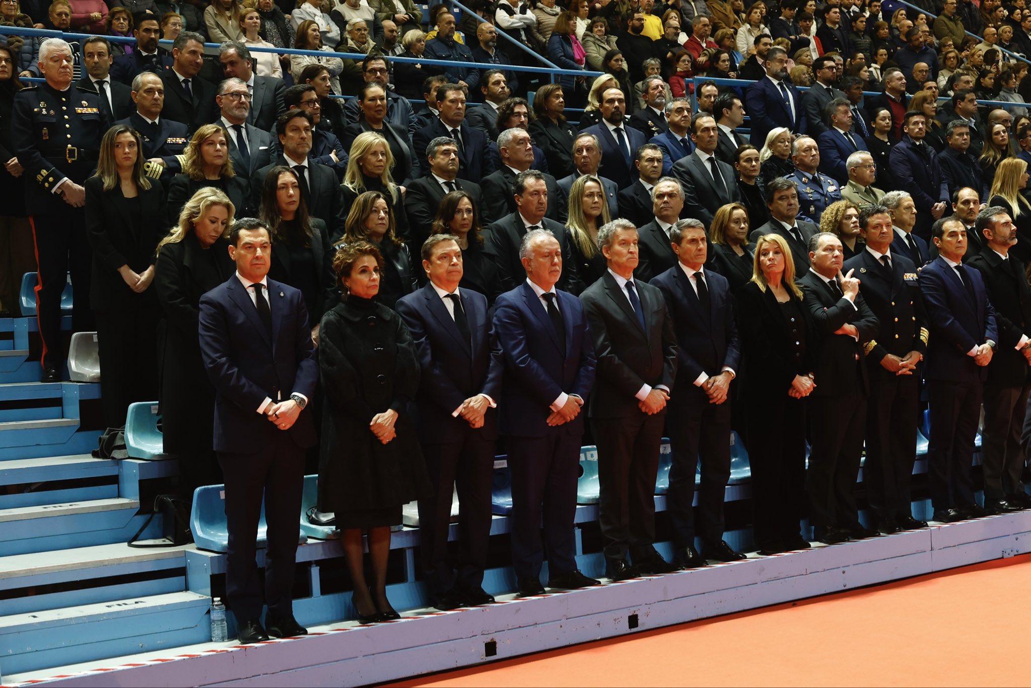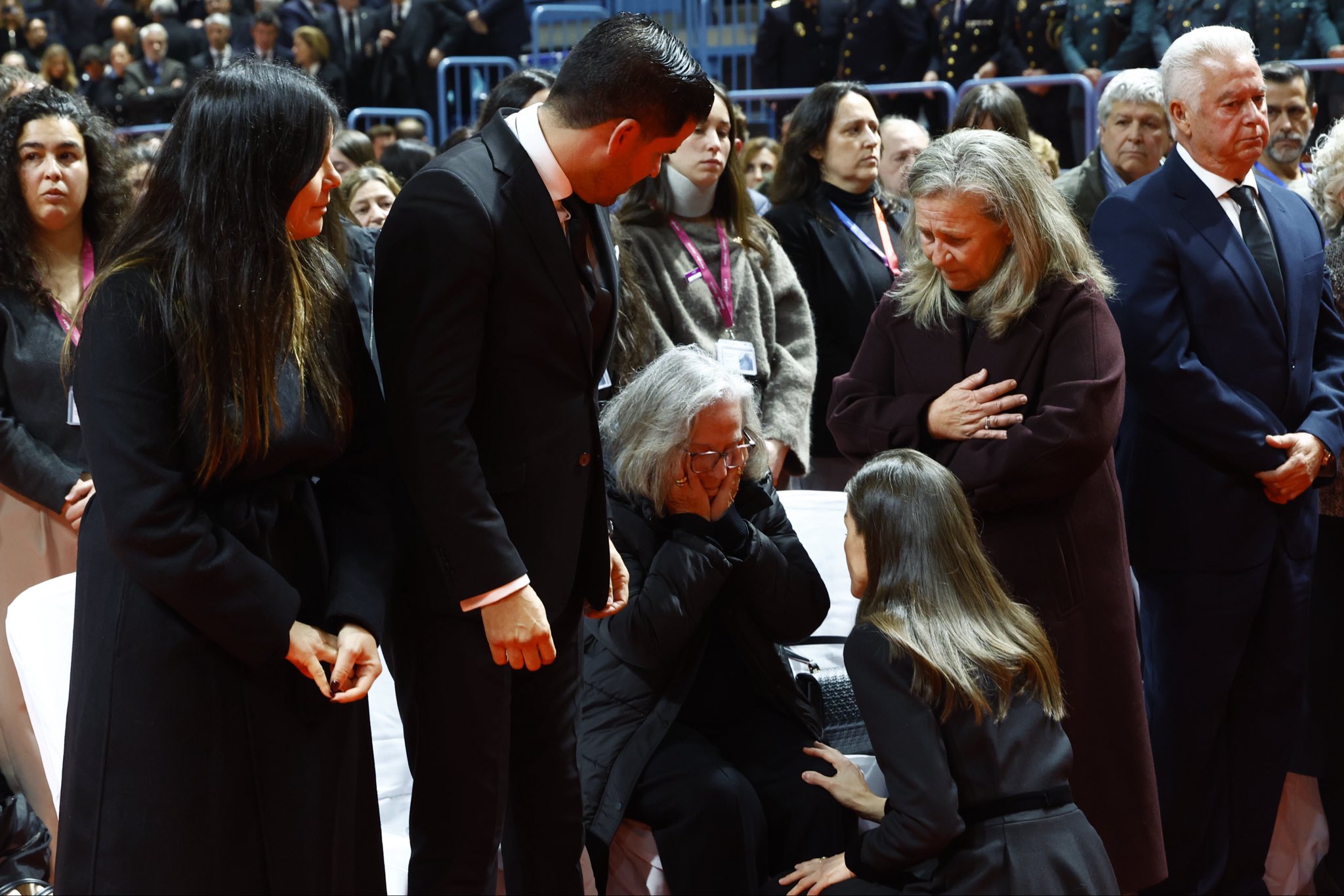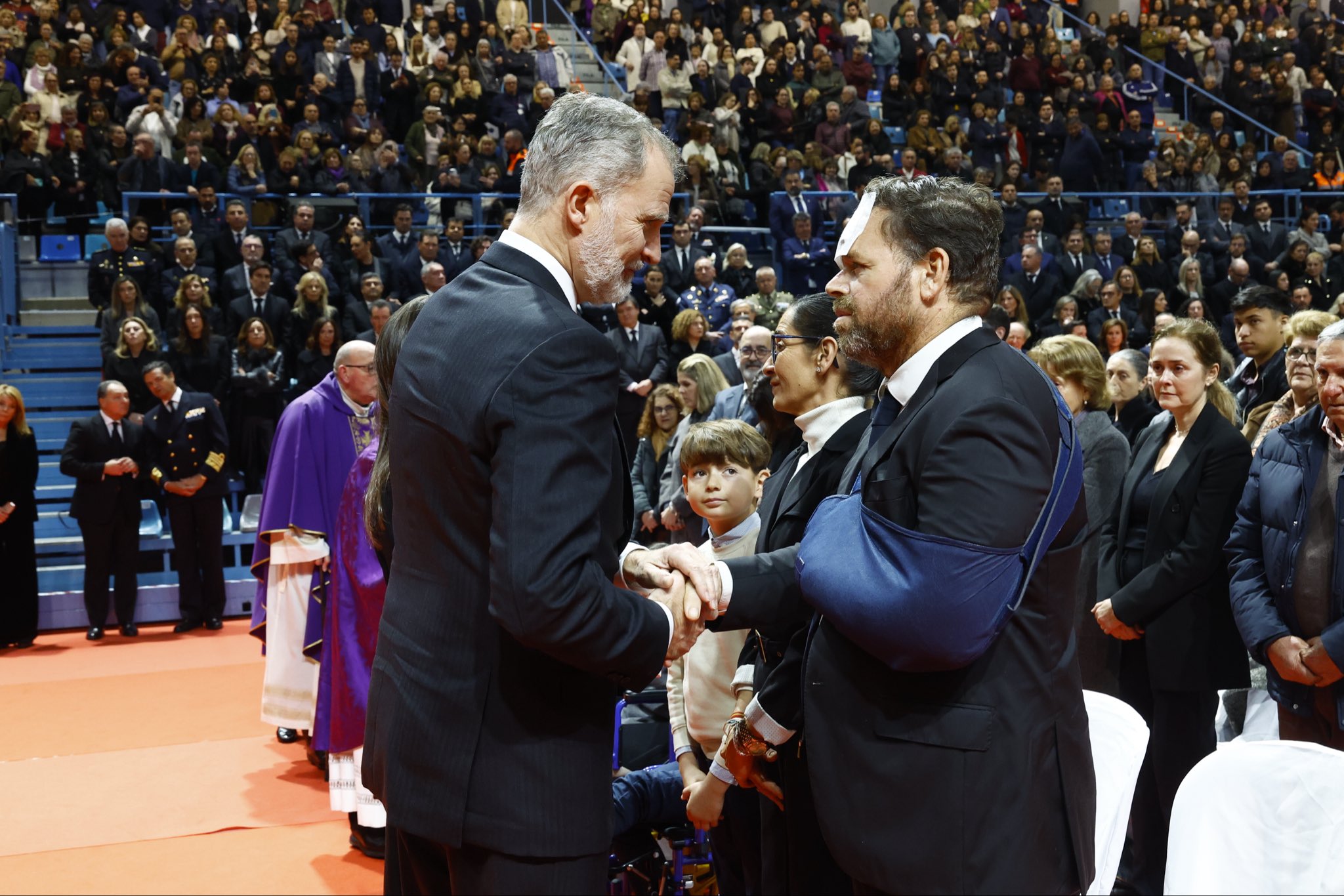 Frente a la entrada discreta de los ministros, Sus Majestades los Reyes, Felipe VI y Letizia, llegaron por el acceso principal y fueron recibidos con un silencio respetuoso que rompió en aplausos. Tras la misa, oficiada por el obispo Santiago Gómez Sierra, los monarcas protagonizaron el momento más humano de la jornada al permanecer más de una hora en la pista del pabellón, saludando uno a uno a los familiares de los 45 fallecidos y compartiendo su dolor sin barreras de seguridad.