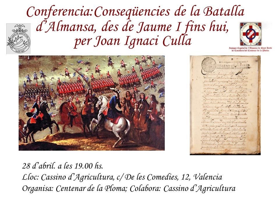 Este dimarts, organizat per l’Insigne Capítul de Cavallers de Sant Jordi del Centenar de la Ploma es celebrarà una conferència en el Cassino d’Agricultura a les 19h. (carrer Comèdies del Cap i Casal), a on Joan Ignaci Culla abordarà la famosa Batalla d’Almansa del 25 d’Abril de 1707 i que va supondre la pèrdua del Furs, les lleis del Regne de Valéncia.