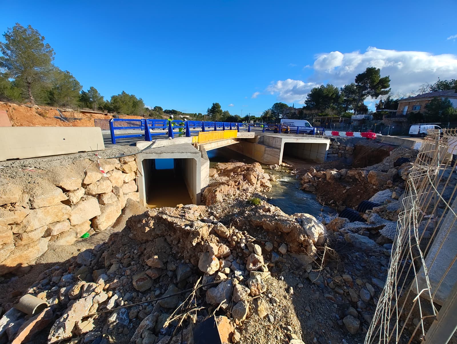 Para lograr este incremento, los técnicos han mantenido la estructura original —que se encontraba en buen estado— y han añadido dos baterías de marcos adicionales a ambos lados, adaptando el puente a la nueva morfología del cauce del barranco.
