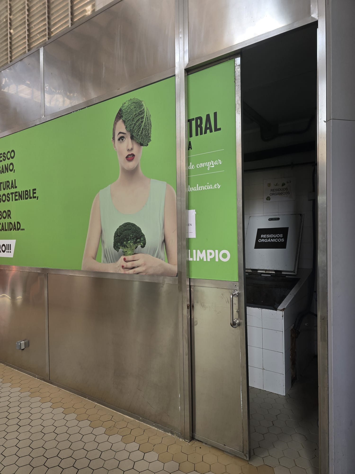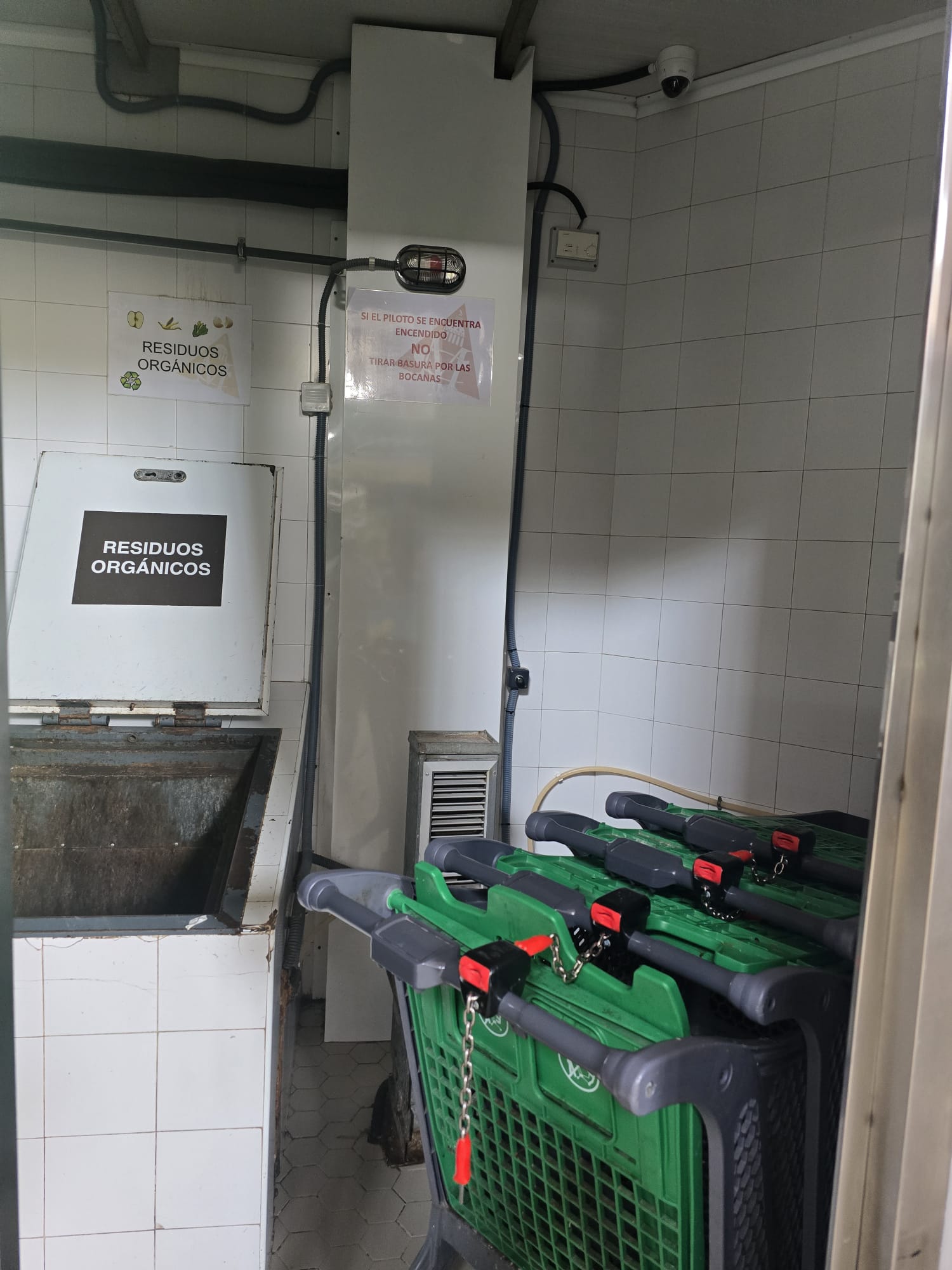 No parece muy higiénico que donde se tira la basura, y por tanto puede caer restos de la misma, estén almacenados carros de la compra, pero ya sabemos que la gestión de esta joya alimentaria y arquitectónica de los valencianos hace aguas por todos lados, así la extraña asociación que continúa llevando la gestión junto con la gerente elegida a dedo, gestión en precario desde 2018, y ya llevan 8 años así, de manera irregular, es conocedora de que la puerta no cierra y está rota desde hace tres meses: la solución dada a los vendedores: que la dejen abierta de par en par.