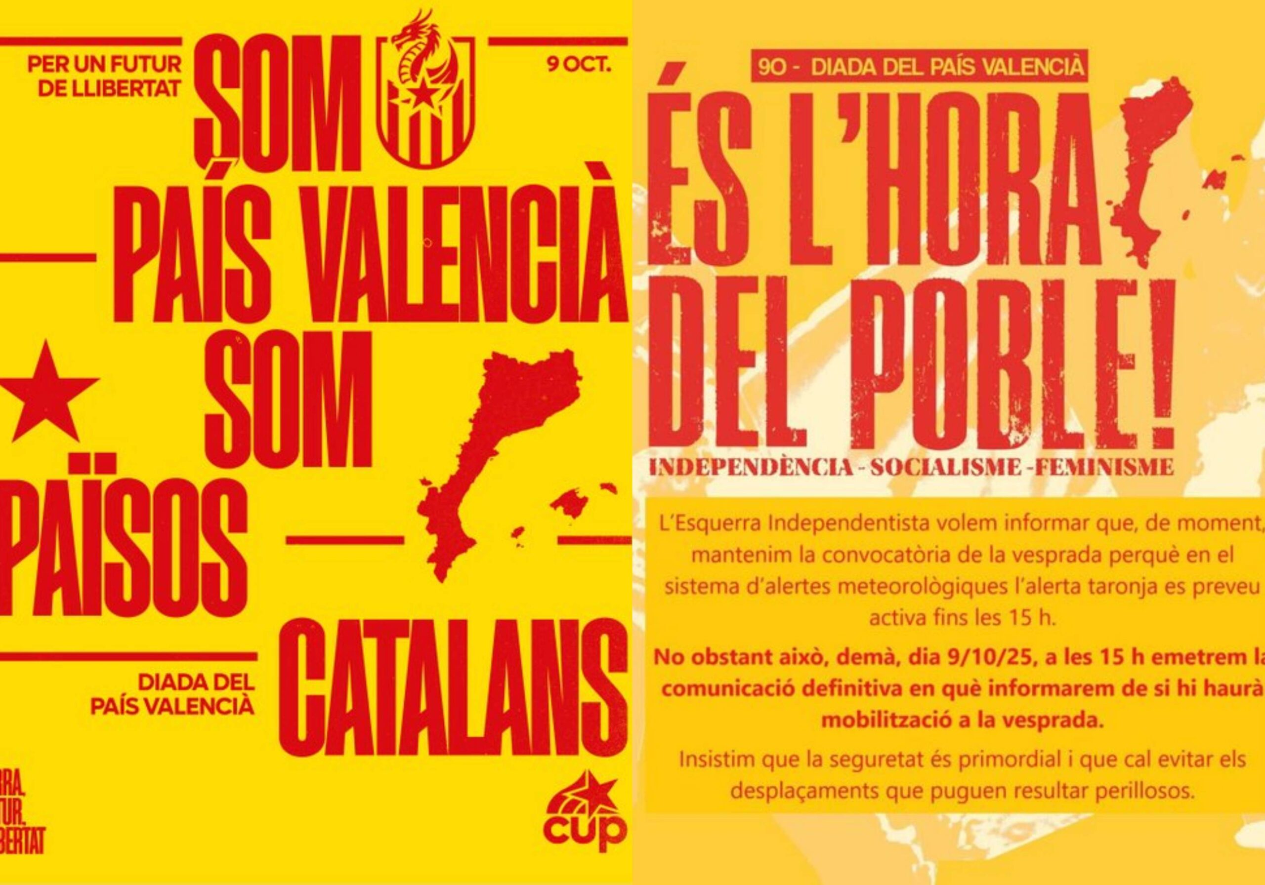 El partido radical catalanista e independentista CUP mantiene a pesar de la alerta naranja su convocatoria para mañana tarde por el centro de Valencia, prevista con salida a la 18h desde la Plaza de San Agustin del Cap i Casal.