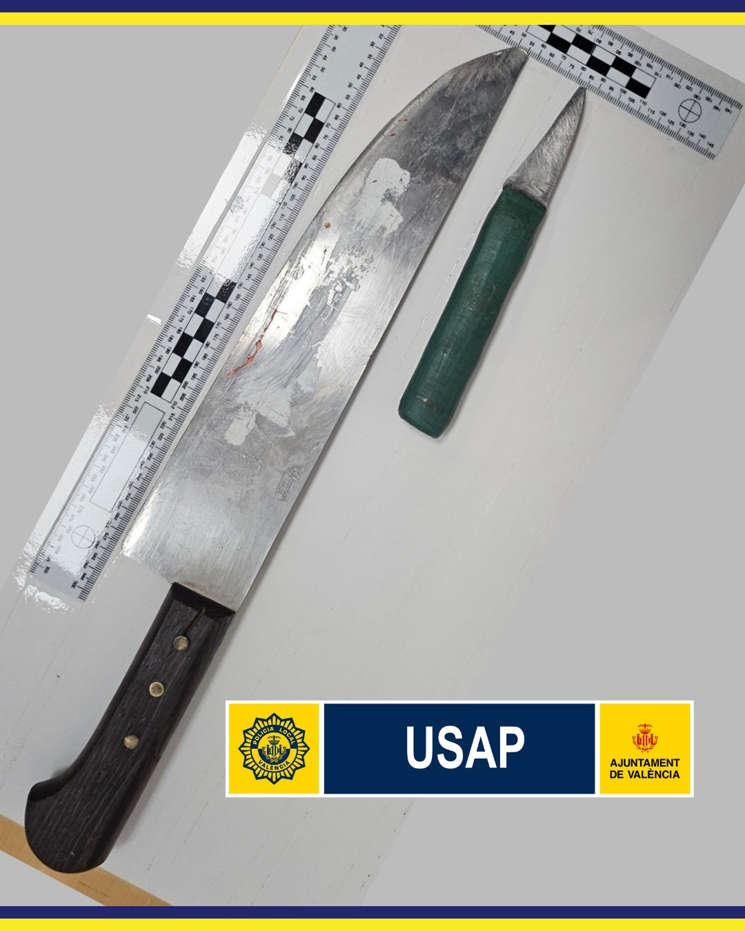 Tras el arresto, la intervención policial permitió localizar el arma principal del ataque: un cuchillo de 27,5 centímetros de hoja con mango de madera, que estaba escondido bajo un coche estacionado. Pero la sorpresa fue mayor al realizar el registro superficial del detenido: portaba una segunda arma blanca, un cuchillo más pequeño con mango de plástico verde.