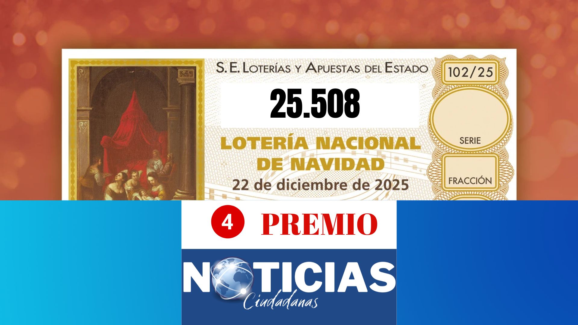 El número 25.508 ha sido agraciado con el segundo cuarto premio del Sorteo Extraordinario de la Lotería de Navidad 2025, celebrado este lunes 22 de diciembre en el Teatro Real de Madrid.