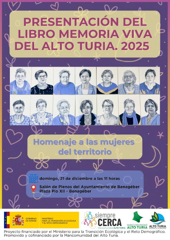 La Mancomunidad del Alto Turia dará un paso decisivo en la preservación de su patrimonio inmaterial el próximo domingo 21 de diciembre. A las 11:00 horas, el Salón de Plenos del Ayuntamiento de Benagéber será el escenario de la presentación de Memoria Viva del Alto Turia 2025, una obra que rescata y dignifica las trayectorias vitales de las mujeres de la comarca.