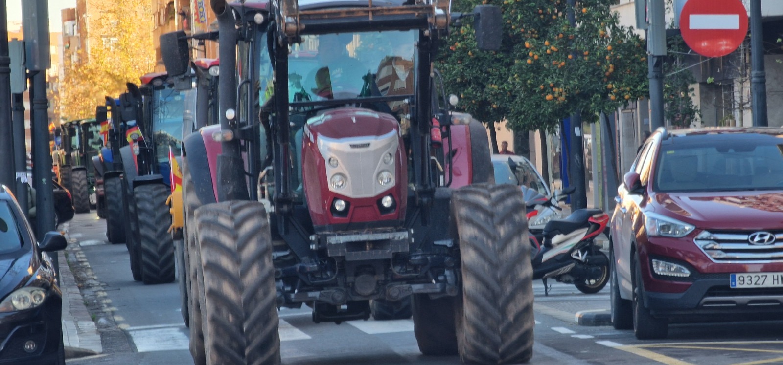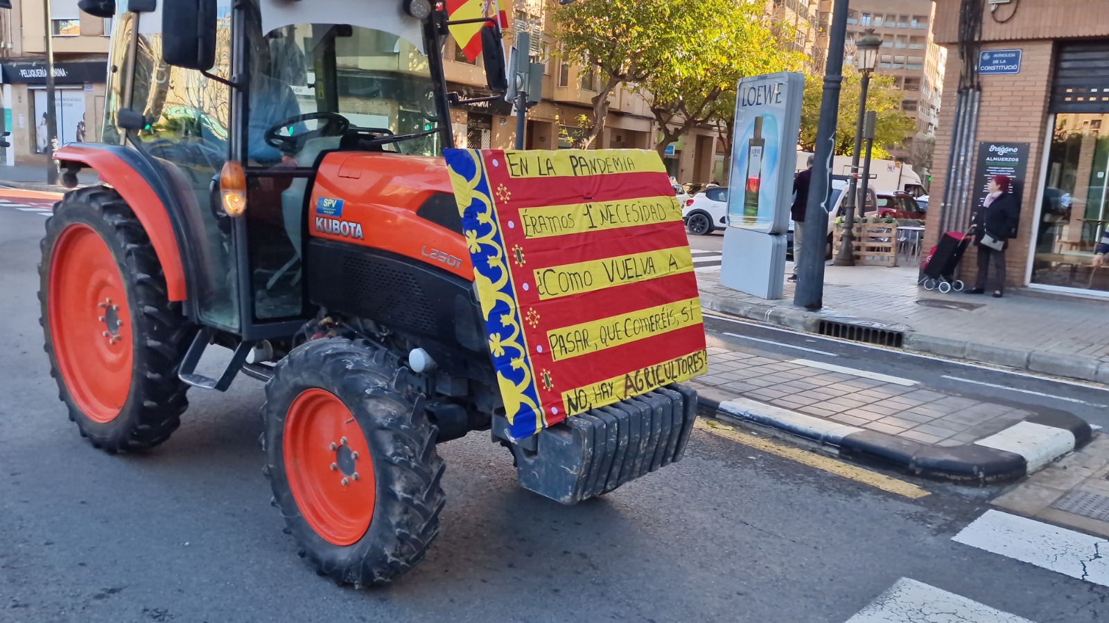 Cerca de una veintena de tractores y camiones, furgonetas, coches y agricultores se han concentrado junto a la Ronda Norte de Valencia y han cruzado la ciudad dirección centro por la avenida de la Constitución, llegando a la margen del río y recorriendo la Calle colón y la Calle Xativa.