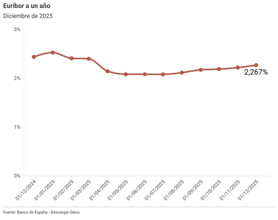 MADRID – El mercado hipotecario español despide el año con una nota de relativa estabilidad. El Euríbor a un año, el índice más utilizado para calcular las cuotas de los préstamos hipotecarios en España, ha cerrado el mes de diciembre en el 2,267%. Aunque la cifra supone un ligero incremento respecto al 2,217% registrado en noviembre, la tendencia a largo plazo sigue favoreciendo a los hipotecados: el índice se sitúa 0,169 puntos por debajo del nivel registrado hace exactamente un año.
