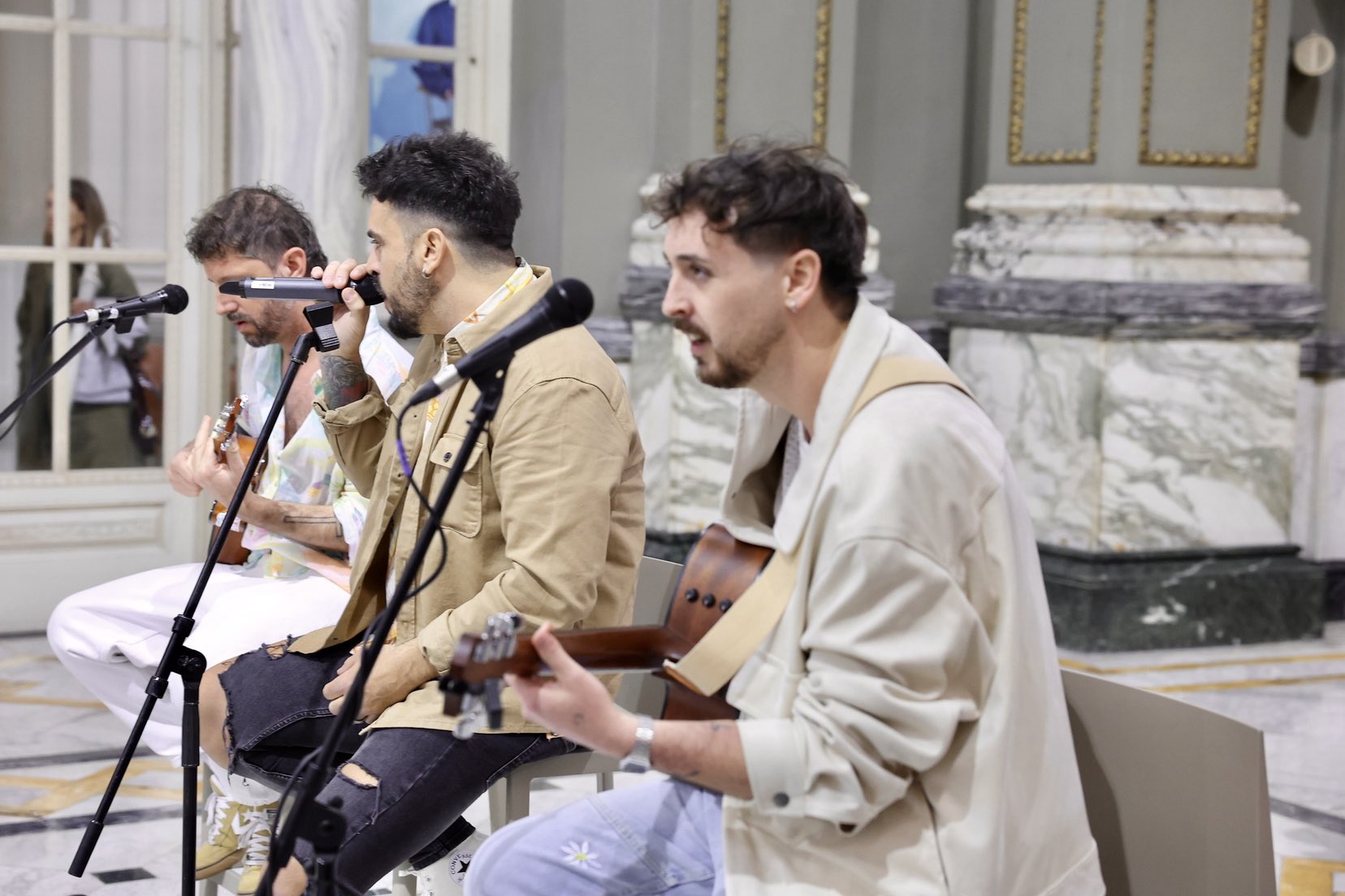 El Salón de Cristal del Ajuntament de Valéncia abandonó por una hora su habitual sobriedad institucional para transformarse en un escenario íntimo. Bajo la luz que se filtraba por sus grandes ventanales, Javi, Vicente y Ramón —integrantes de Bombai— desgranaron sus éxitos más conocidos en un formato desenchufado, cargado de esa energía positiva y «buen rollo» que define el ADN de la banda. Temas como «Solo si es contigo» resonaron con una calidez especial, dedicados directamente a quienes hoy encarnan el sentimiento de todo un pueblo.