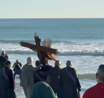 En una mañana de Viernes Santo marcada por el salitre y el silencio, la imagen del Cristo del Salvador ha cumplido con el rito ancestral de tocar las aguas, consolidando el acto más identitario de la Semana Santa Marinera.