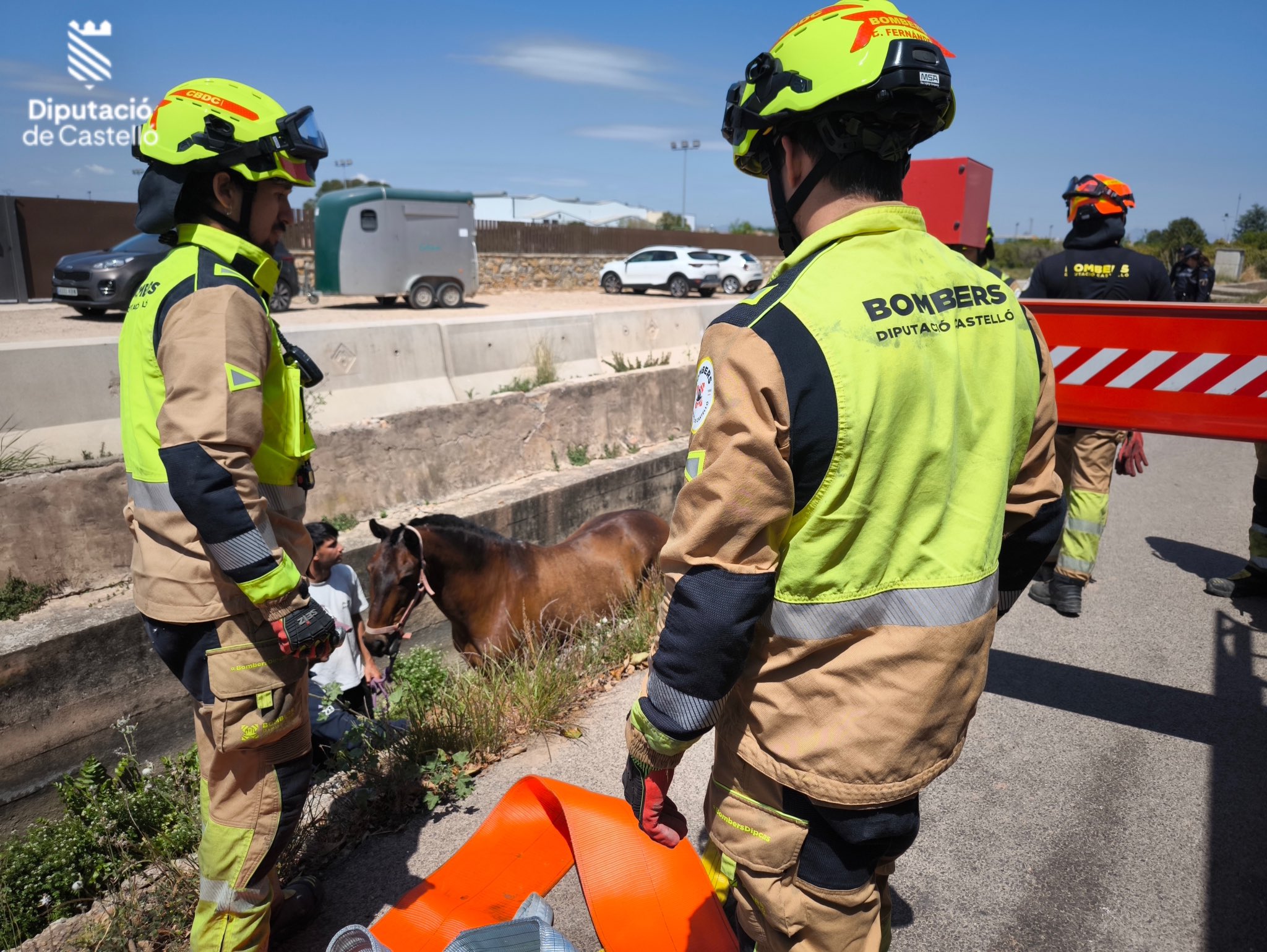 Tras recibir el aviso de que un equino no podía salir por sus propios medios del cauce de la acequia, el Consorcio Provincial de Bomberos de Castellónmovilizó una unidad especializada. Ante la dificultad del terreno y el peso del animal, los efectivos decidieron emplear un vehículo de rescate en altura.
