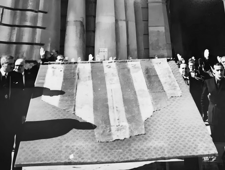 Aquell estandart, de forma triangular i gastada, res tenia a vore en la nostra història real. Fon presentat com si fora un símbol de la presa de Valéncia per Jaume I, pero no existia cap base documental ni archivística que avalara tal invenció. L’objectiu era clar: substituir l’autèntic símbol valencià per un atre que encaixara millor en el relat “d’unitat d’Espanya” que el règim volia transmetre.