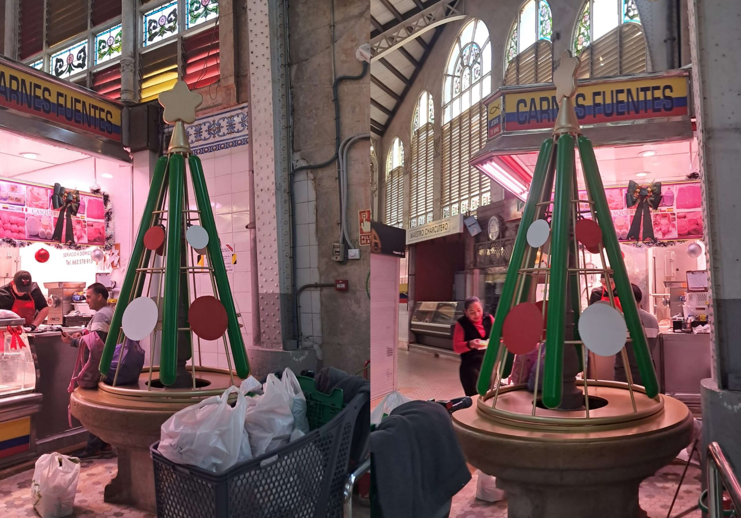 La extraña decoración navideña del Mercado Central incluye tapar las fuentes históricas del mismo y utilizarlas como mero soporte para colocar unos elementos que se tratan de asemejar a unos abetos modernos. Pero que de facto en vez de poner el valor el patrimonio artístico e histórico del Mercado Central lo ocultan y utilizan como mero soporte.