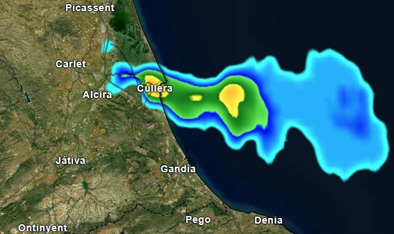 Se trata de una tormenta que se ha formado de repente en la zona de Llaurí y se ha movido muy lentamente hacia la costa, barriendo Llaurí, Favara y Cullera.