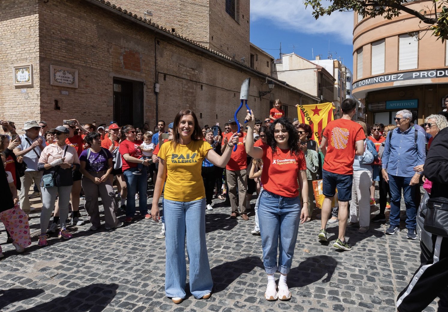 Lo que se anunciaba como un acto de promoción lingüística con la cantante ‘La Maria’ como portadora de la llama, ha derivado en una concentración marcada por la exhibición de esteladas y proclamas en favor de los denominados «Països Catalans». Durante el recorrido y la llegada a la plaza, se han escuchado cánticos que asumen la identidad catalana para el pueblo valenciano, una postura que niega la idiosincrasia propia de la identidad valenciana reconocida legalmente.