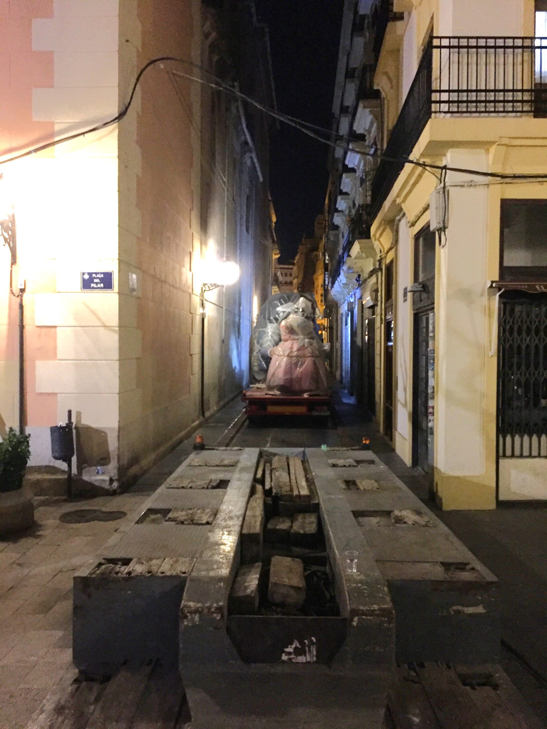 La Falla del Pilar tiene que meter sus góndolas por la estrechísima Calle de Maldonado, una maniobra muy complicada, y después salir estas góndolas de gran tamaño. Ni las calles ni el Ayuntamiento se lo pone nada fácil, ya que en esta Ciudad a pesar de que las Fallas lo cambian todo una vez al año, el diseño de sus calles e infraestructuras nunca tiene en cuenta estos aspectos y se coloca mobiliario urbano sin pensar, como en Ruzafa que tiene que eliminar desde farolas a semáforos, o zonas con aparcamientos para bicicletas colocados donde suele ir una falla o una carpa…