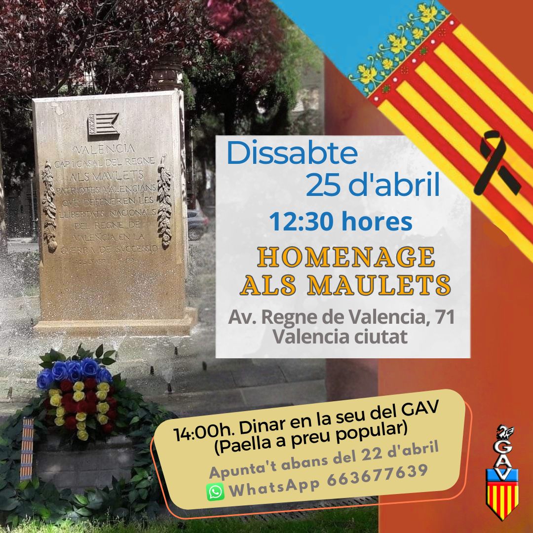 Este 25 d’abril el Grup d’Acció Valencianista torna a celebrar l’acte commemoratiu de la Batalla d’Almansa, que tindrà lloc el dissabte 25 d’abril a les 12:30 hores. En el monument als Maulets (Avinguda Regne de Valéncia, 71 – Valéncia Ciutat).