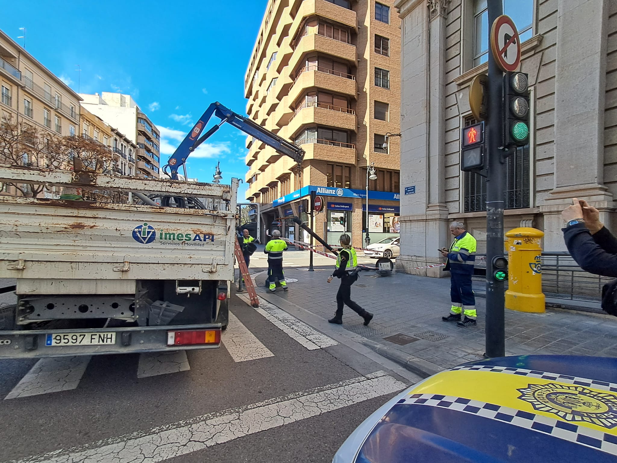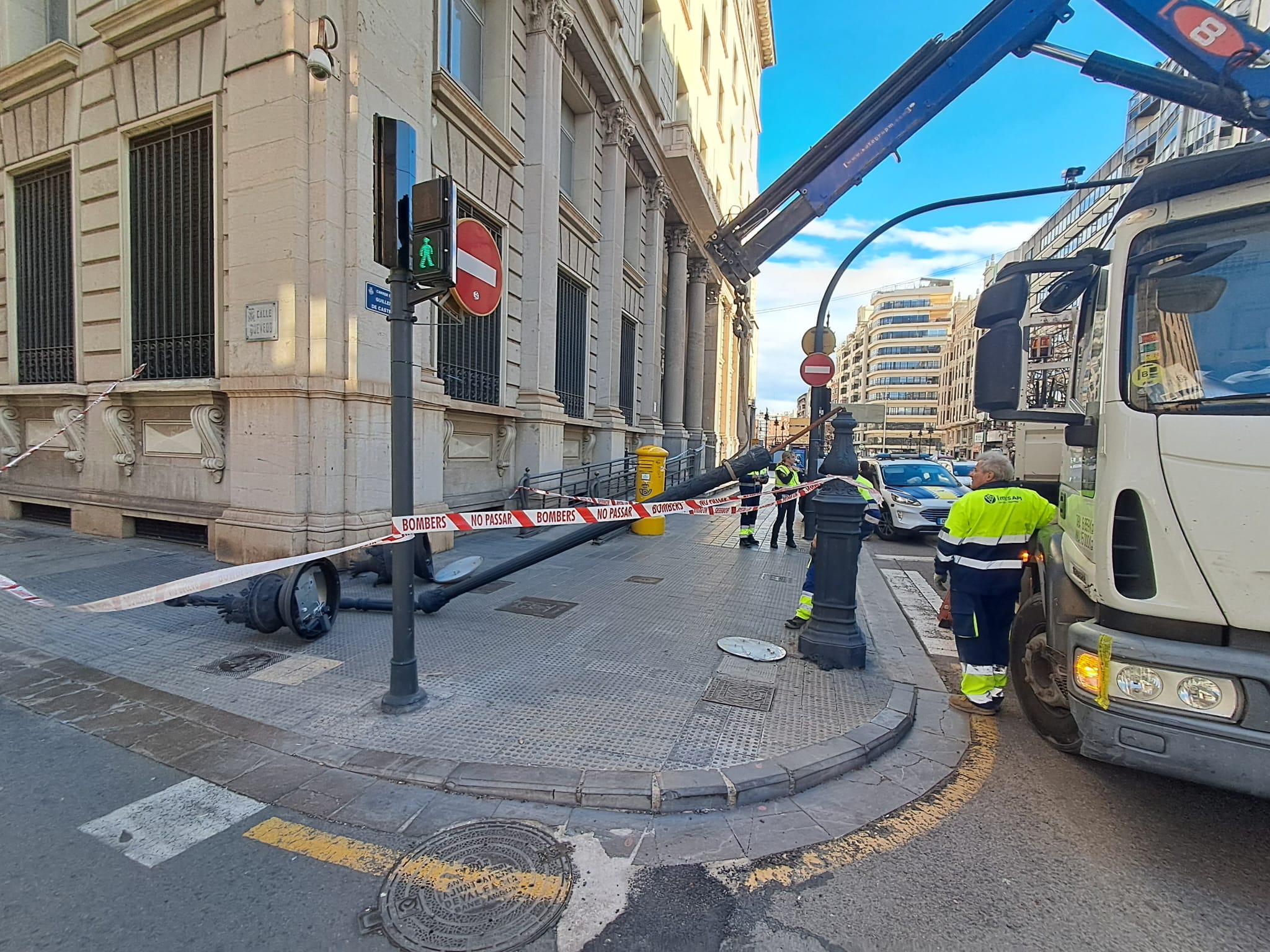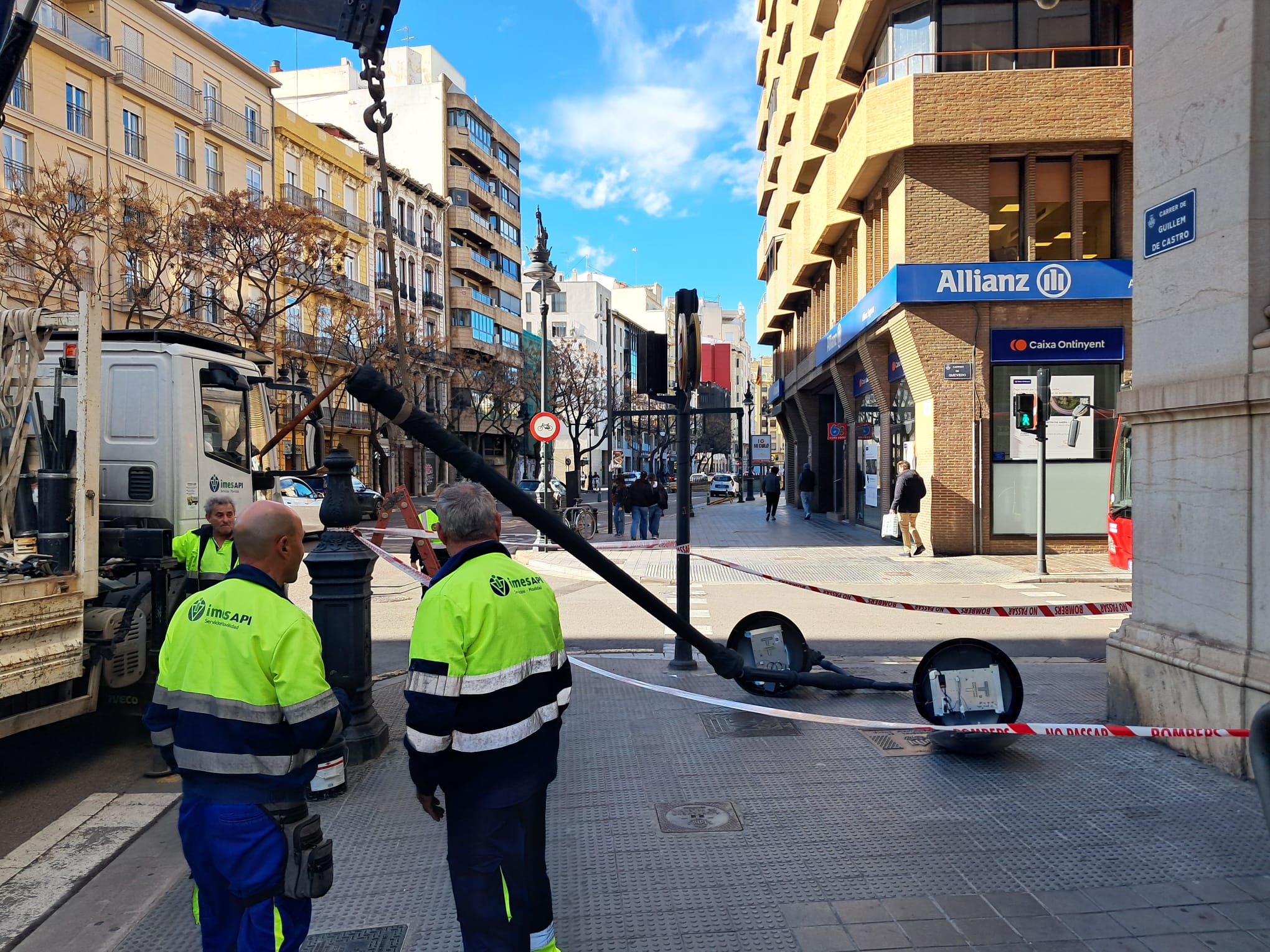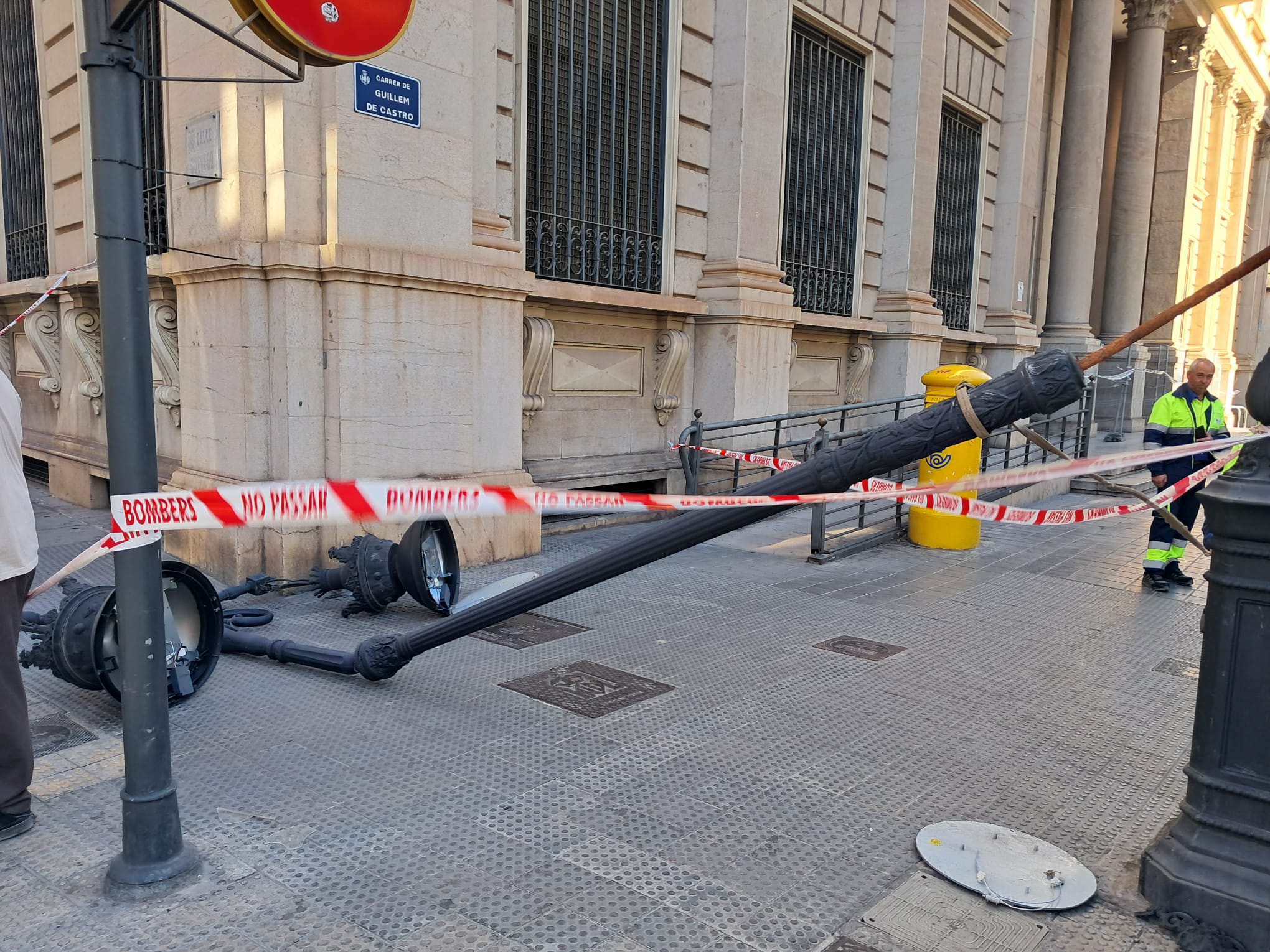 La farola ha caído sobre los peatones tras seccionarse. Estaba situada justo en la confluencia de las Calles Quevedo y Guillém de Castro y en este momento, una unidad de policía local ha acordonado la zona y la contrata municipal de movilidad está retirando la farola caída sobre la acera.