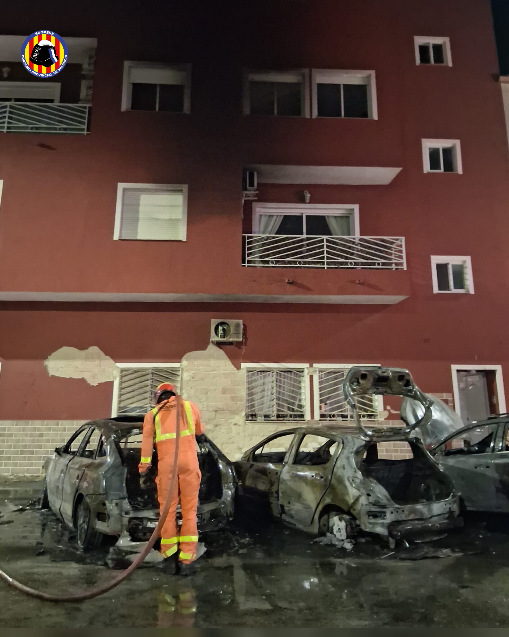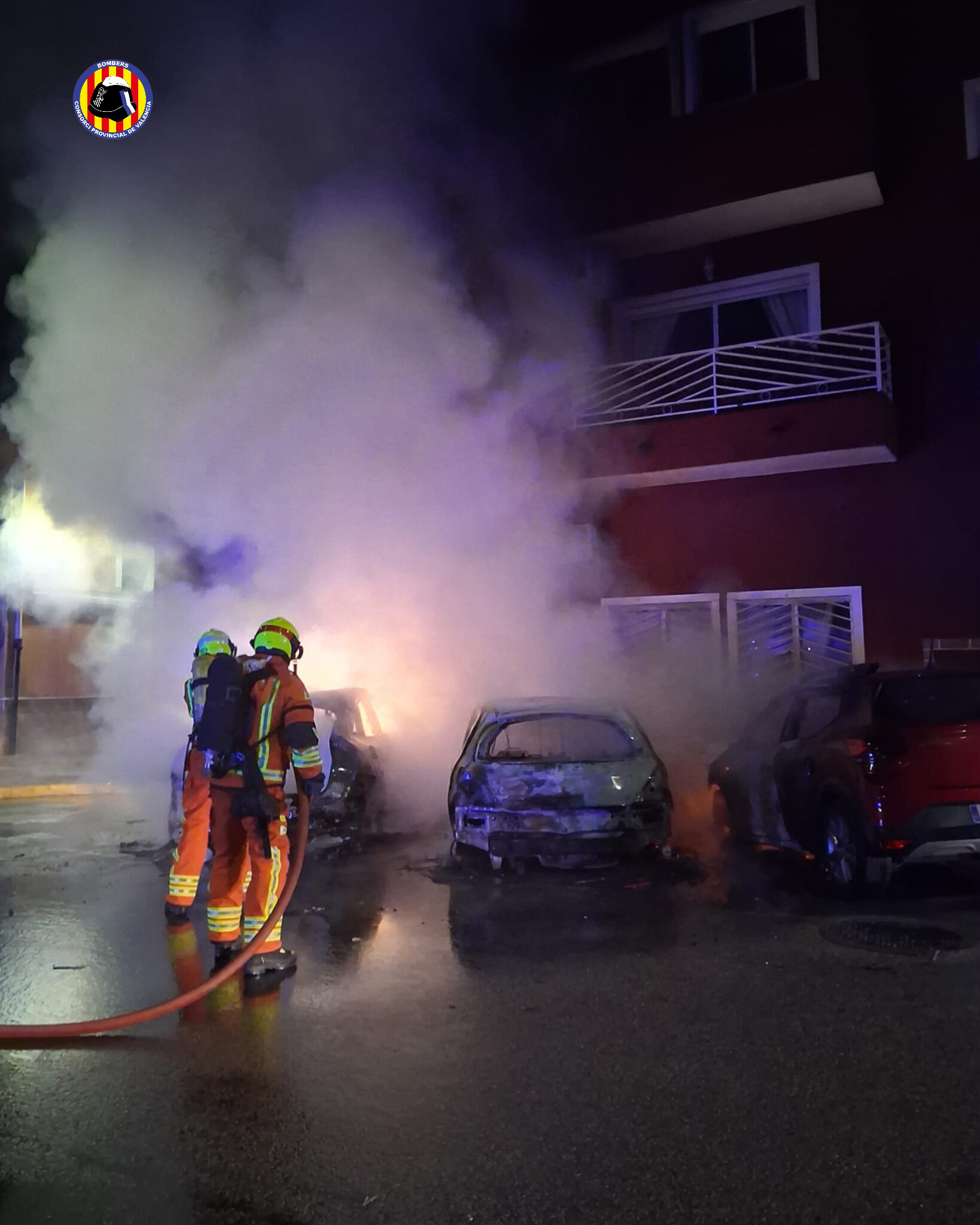 BENIARJÓ — La tranquilidad de la noche en el municipio de Beniarjó (La Safor) se vio truncada ayer por un grave incendio que se originó en la vía pública. El fuego, cuyas causas aún están bajo investigación, terminó calcinando por completo tres vehículos y provocando daños de diversa consideración en la fachada de un edificio cercano.