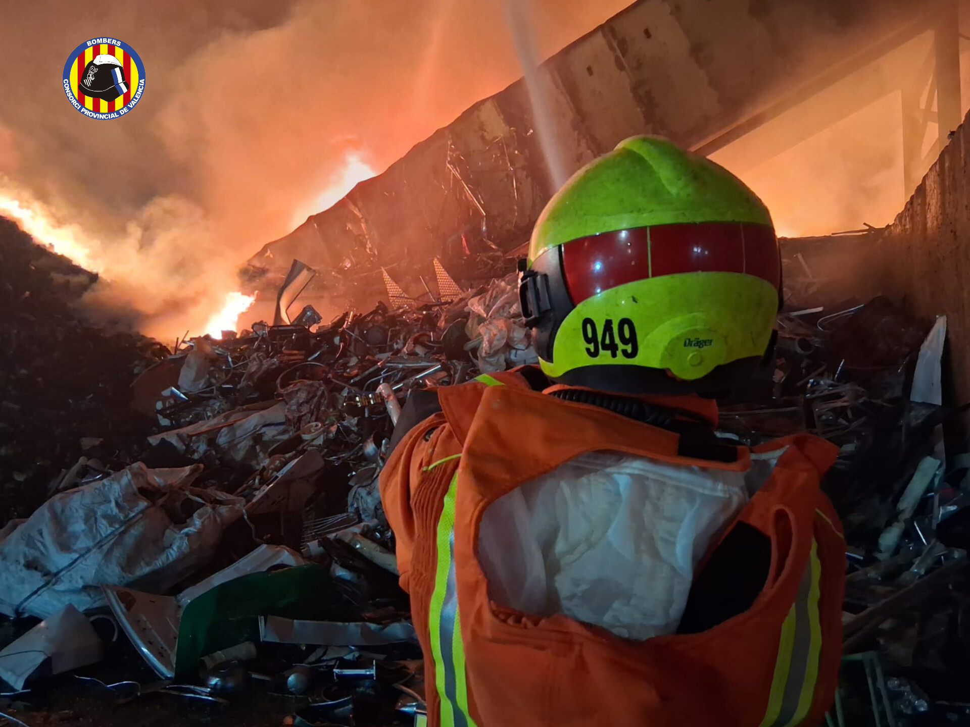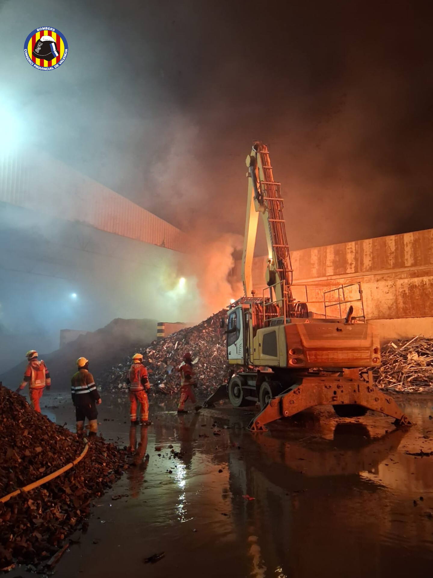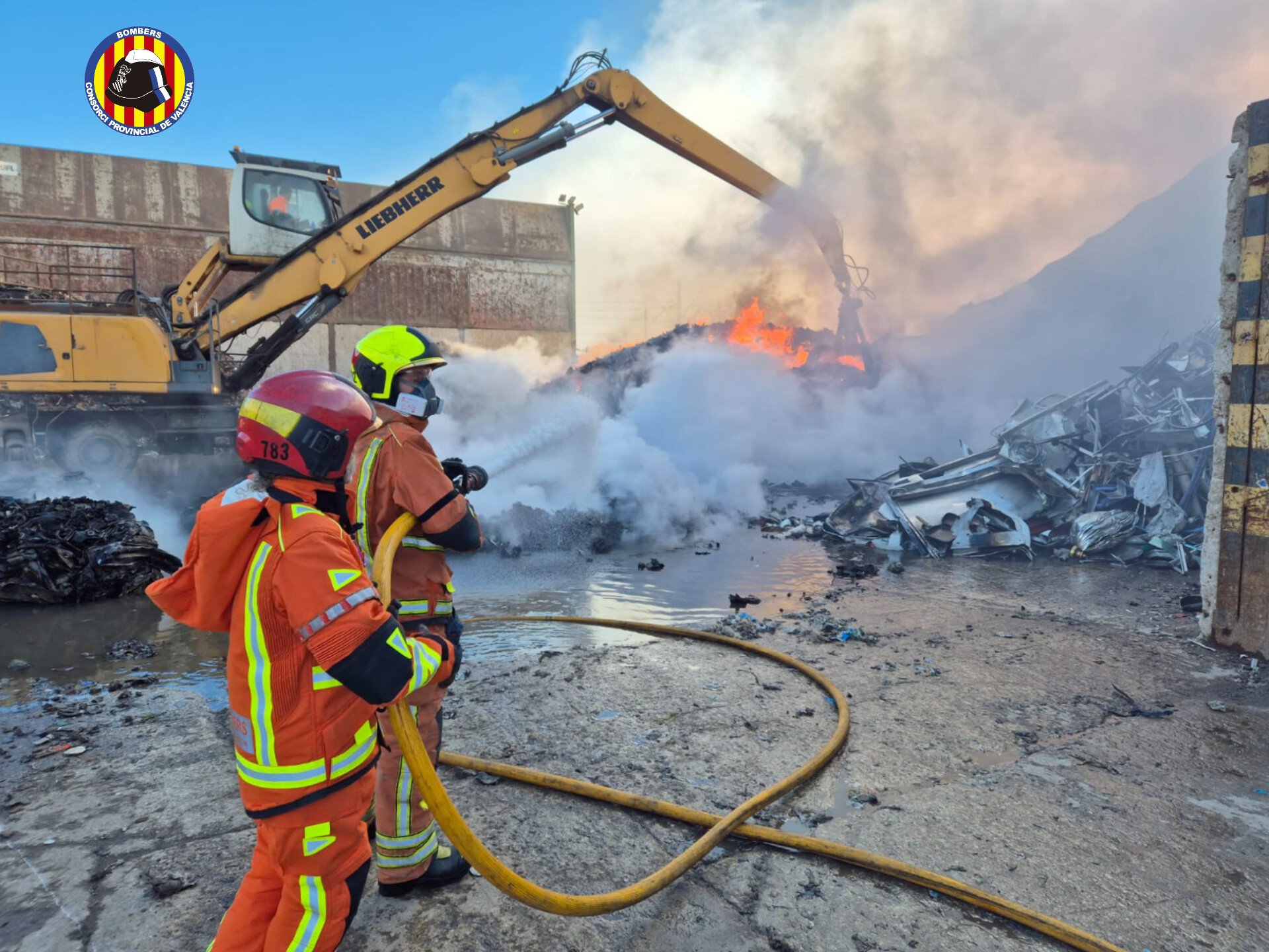 Dada la naturaleza del material combustible —principalmente metales y residuos industriales acumulados—, las labores de apagado resultan especialmente complejas. Según han informado fuentes del Consorcio, el trabajo con mangueras ya no es suficiente por sí solo. Por ello, los efectivos están utilizando maquinaria pesada para remover las grandes montañas de chatarra, separar el material que aún no ha ardido y facilitar que el agua penetre en los focos internos del incendio.