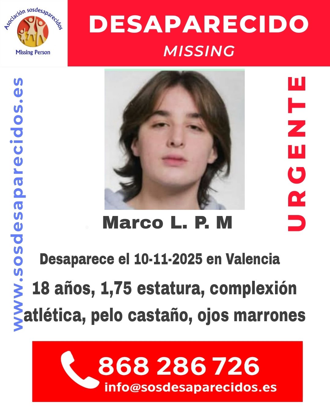 Marco L.P.M. es un joven valenciano de 18 años que, según datos ofrecidos por la Policía Nacional, fue visto por última vez durante la madrugada en una zona cercana al barrio de Patraix. Vestía pantalones vaqueros, una chaqueta negra y zapatillas deportivas blancas. Su familia reportó su desaparición pocas horas después, al no tener noticias suyas ni poder contactarlo a través del teléfono móvil.