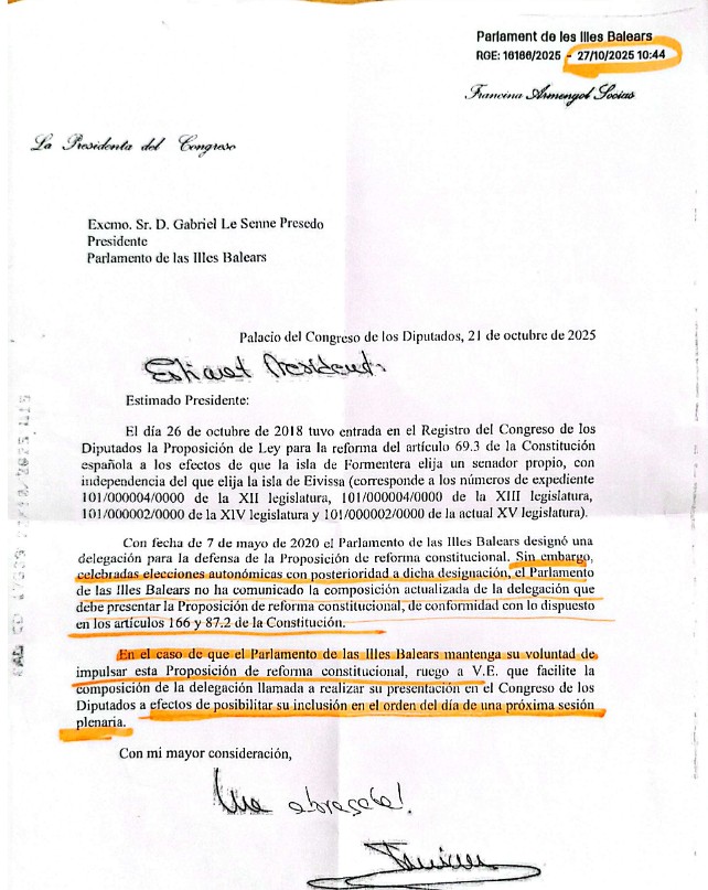 Por parte de la Comunidad Balear se ha pedido que se reforme la Constitución para que Formentera tenga un senador territorial, lo que implica modificar el artículo 69-3 de la Constitución Española, ya que ahora lo tiene compartido con Ibiza.