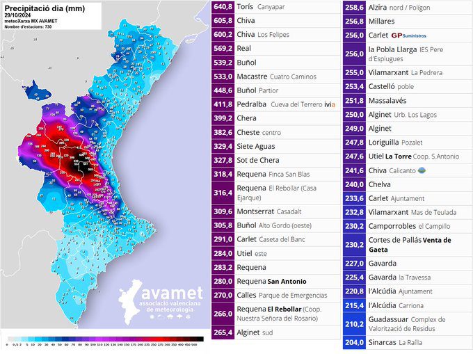 Según los datos recopilados por AVAMET, algunos pluviómetros de la red ciudadana registraron acumulados de más de 480 litros por metro cuadrado en apenas doce horas. El episodio provocó un aumento súbito de caudales en los barrancos del interior de Valencia, que desembocaron en graves inundaciones en municipios de la Ribera, l’Horta y el área metropolitana.