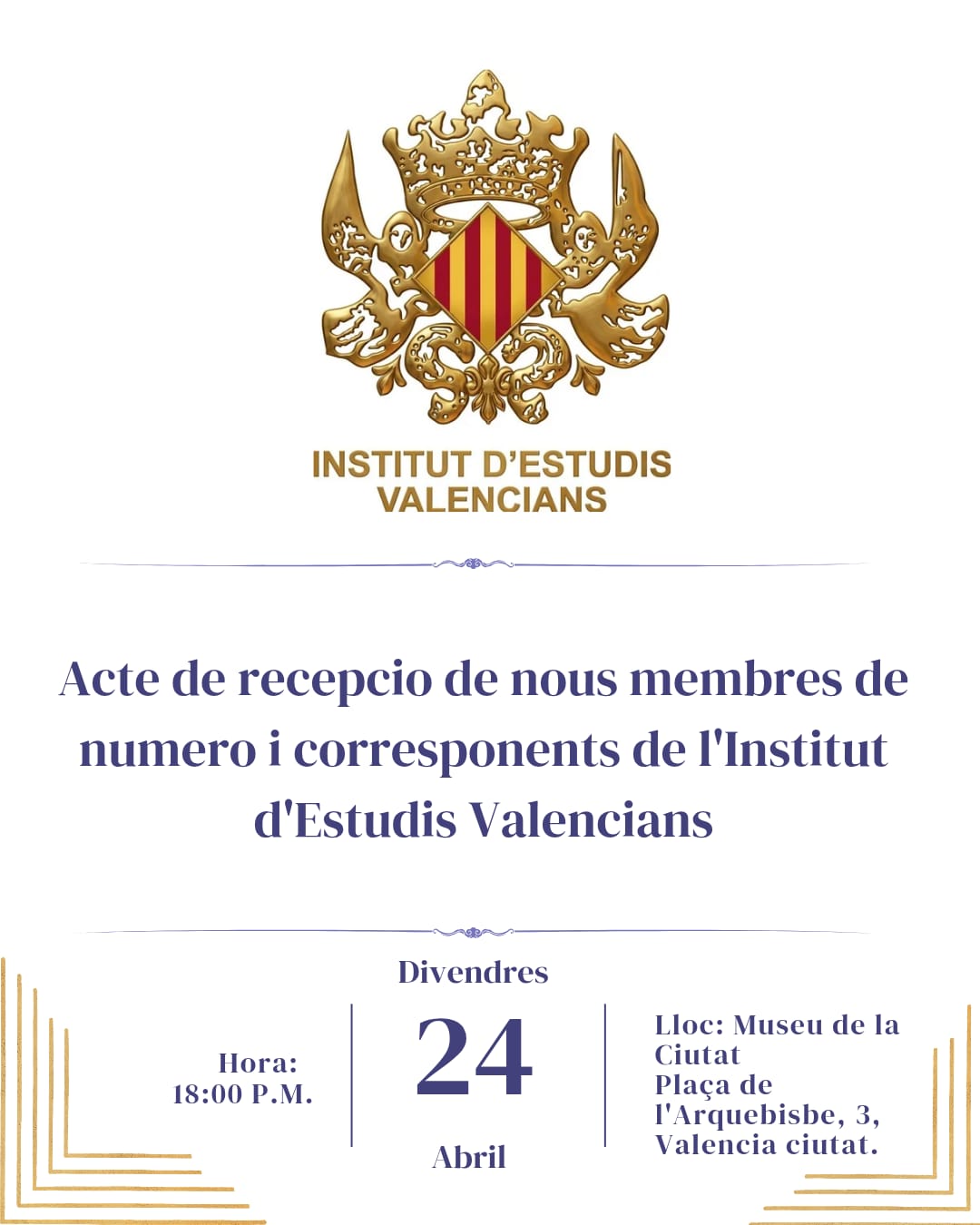 L’INEV, el Institut d’Estudis Valencians celebra esta vesprada en el Museu de la Ciutat l’acte de recepcio de nous membres de numero, seguint en l’ampliacio d’esta institucio que seguix Les Normes d’El Puig i demostrant que cada día està mes viva la normativa per a la Llengua Valenciana.